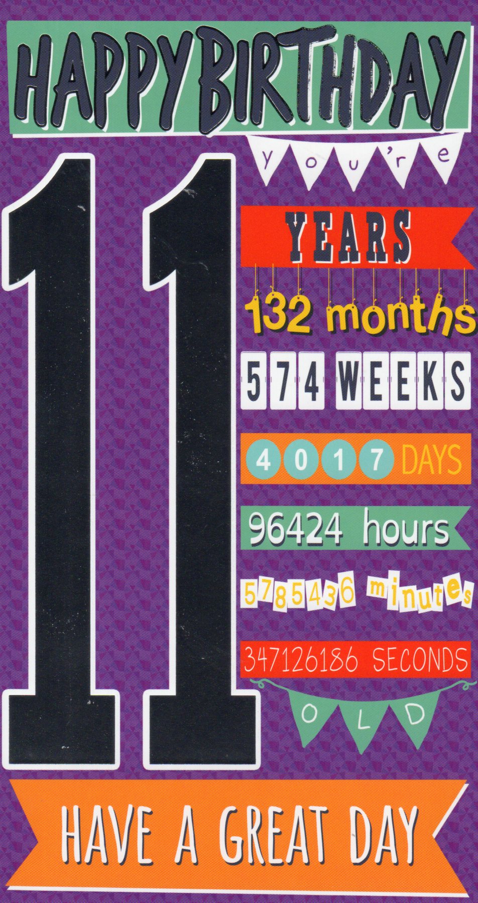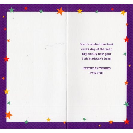 Inside reads: You're wished the best every day of the year, Especially now your 11th birthday's here! Birthday Wishes For You