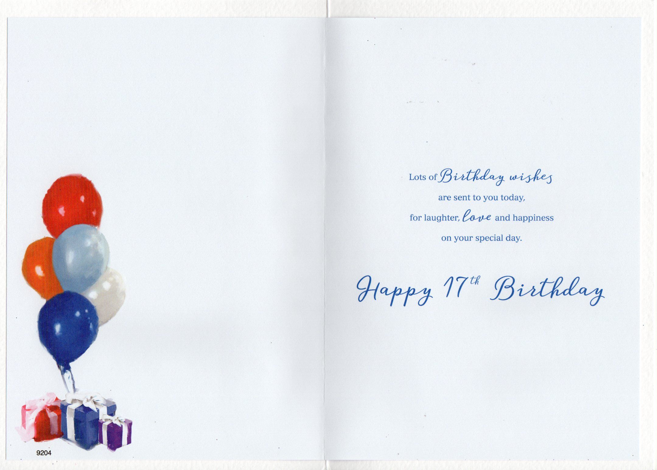 Inside reads: Lots of Birthday wishes are sent to you today, for laughter, love and happiness on your special day. Happy 17th Birthday.