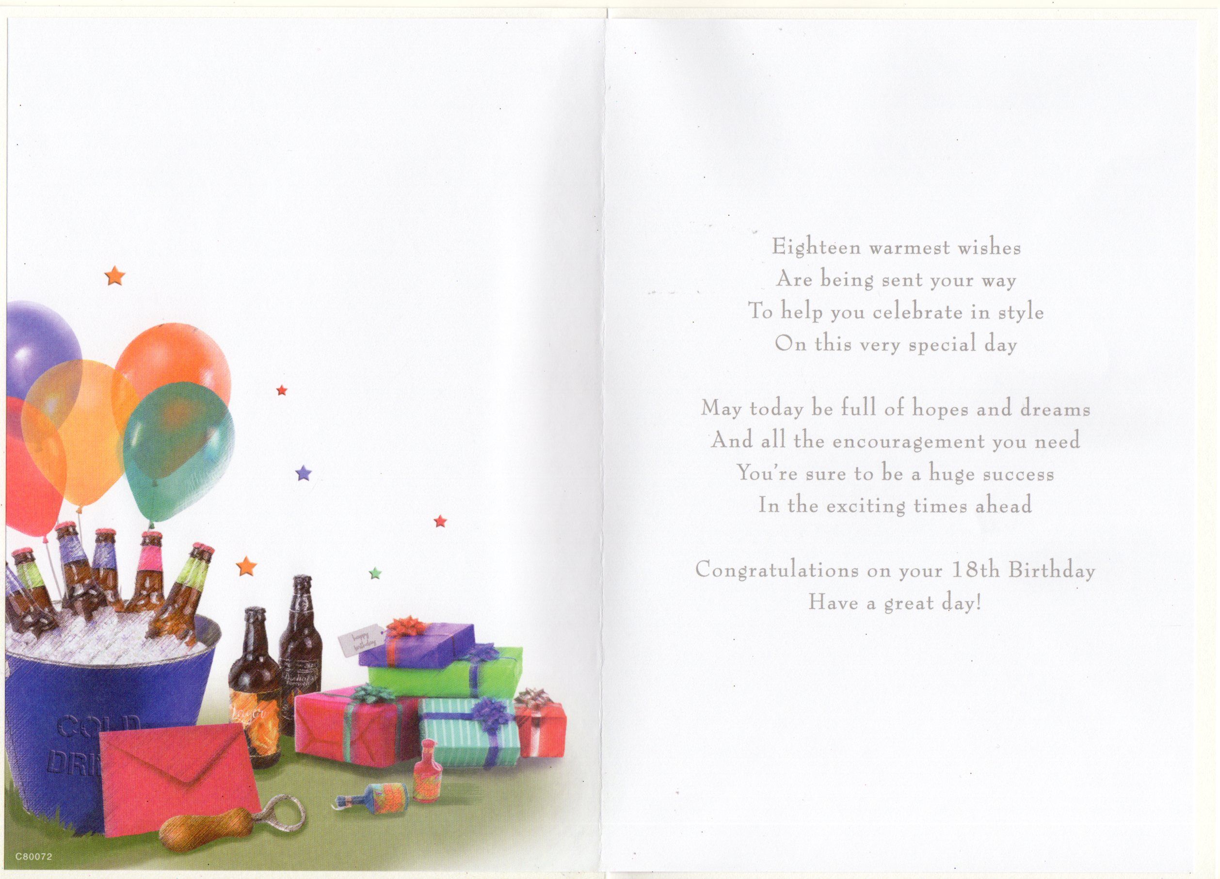 Inside reads: Eighteen warmest wishes Are being sent your way To help you celebrate in style On this very special day May today be full of hopes and dreams And all the encouragement you need You're sure to be a huge success In the exciting time ahead Congratulations on your 18th Birthday Have a great day!