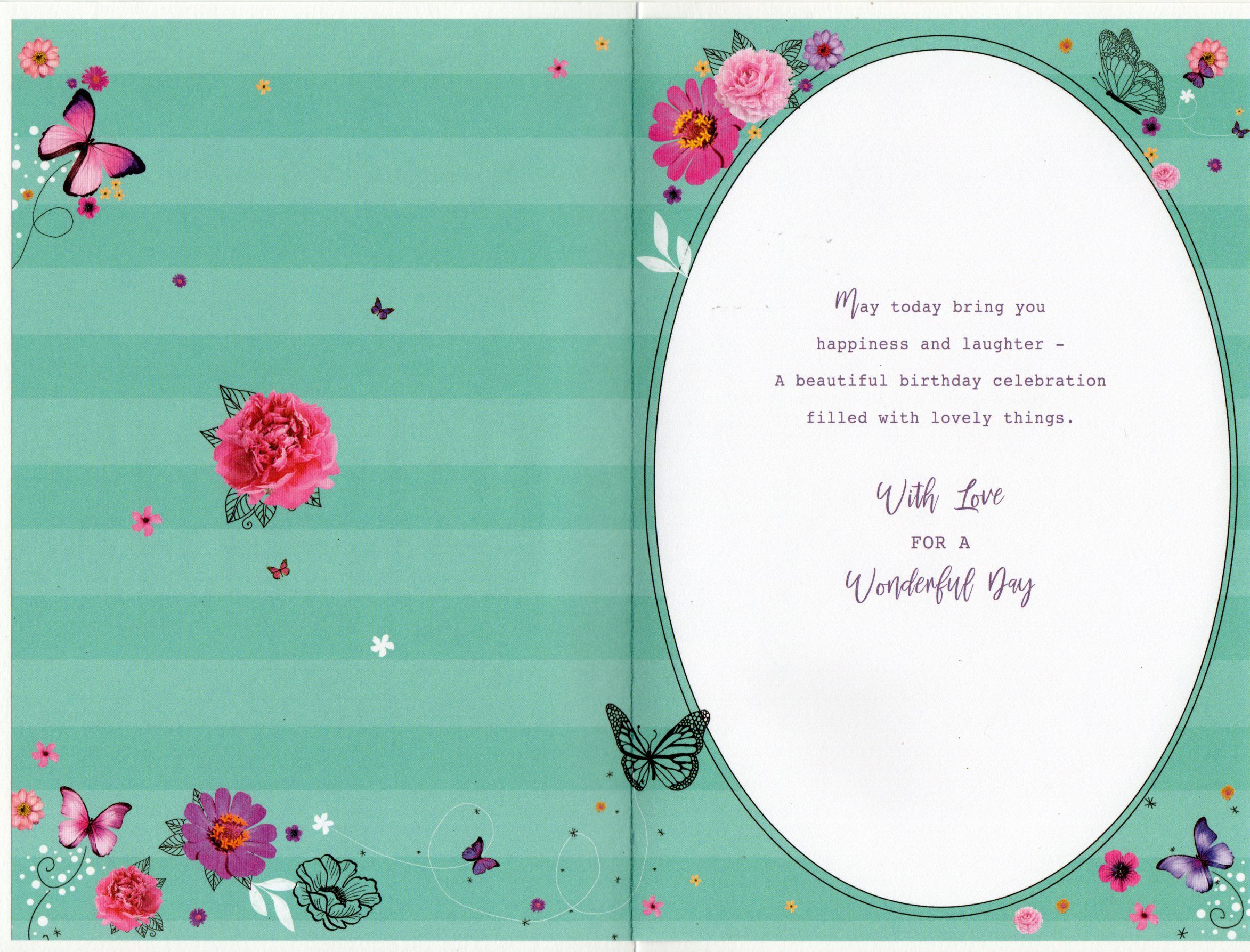 Inside reads: May you today bring you happiness and laughter A beautiful birthday celebration filled with lovely things.