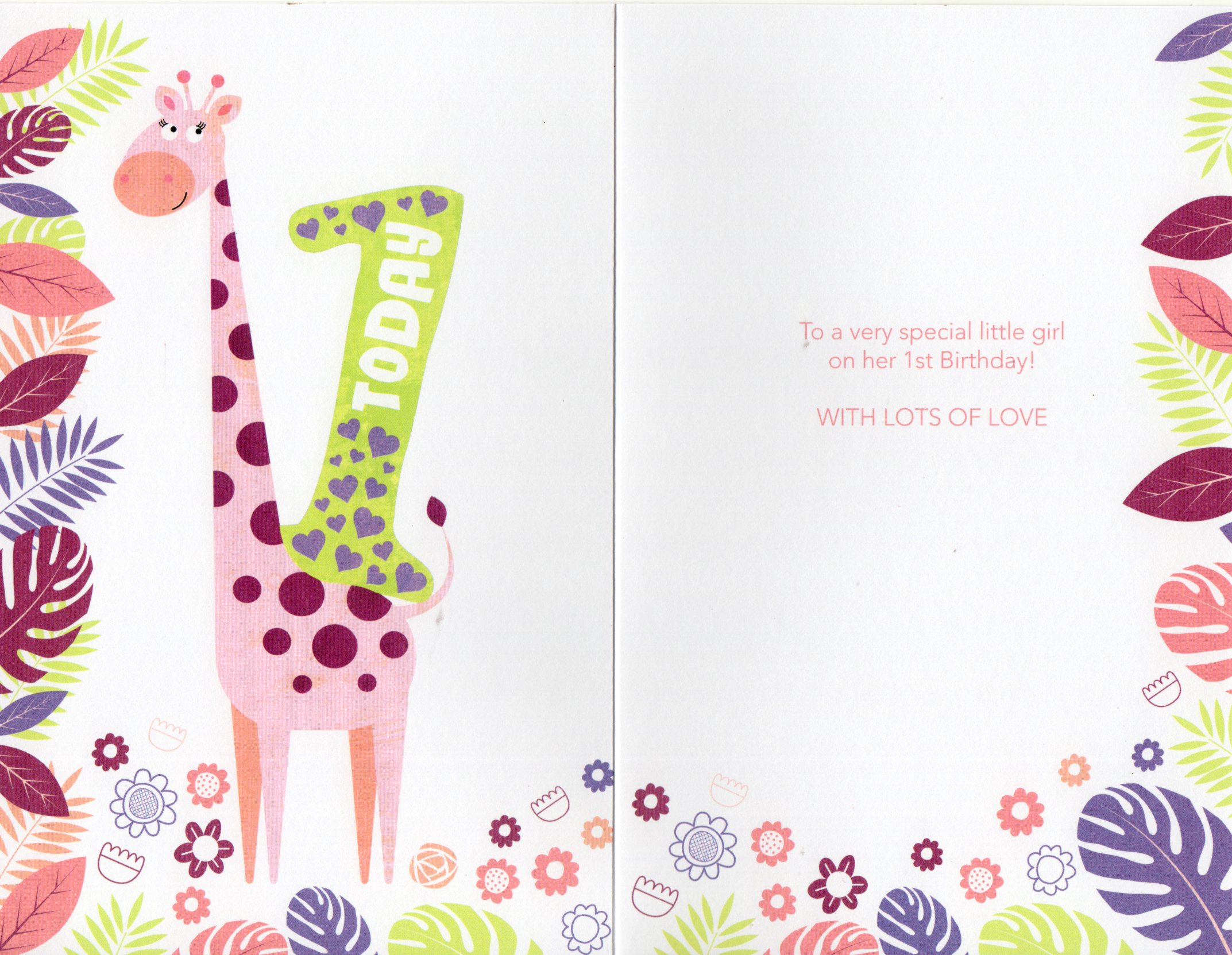 Inside reads: To a very special little girl on her 1st Birthday! With Lots Of Love