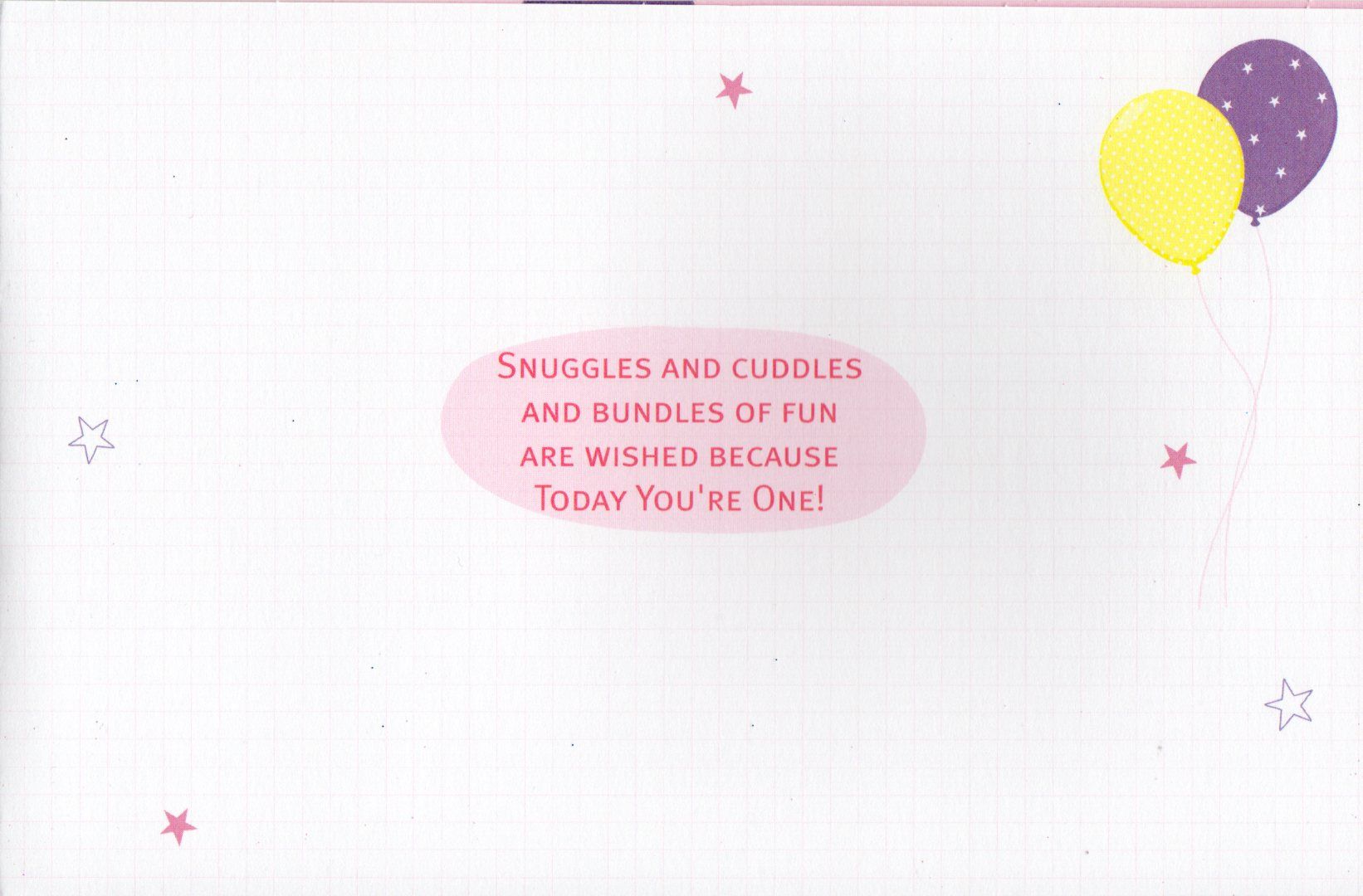 Inside reads: Snuggles and Cuddles and Bundles of Fun are Wished Because Today You're one!