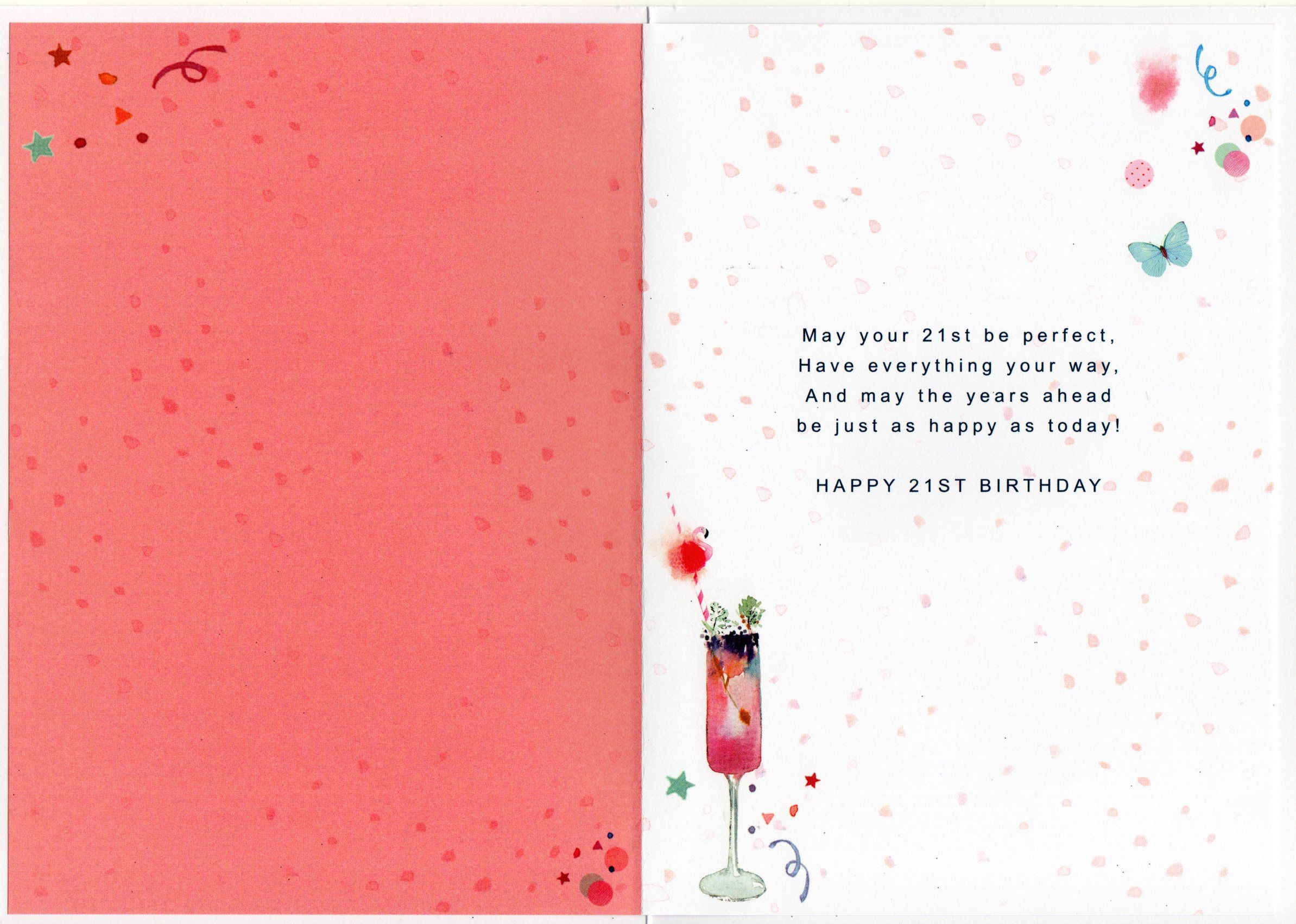 Inside reads: May your 21st be perfect, Have everything your way, And may the years ahead be just as happy as today! Happy 21st Birthday