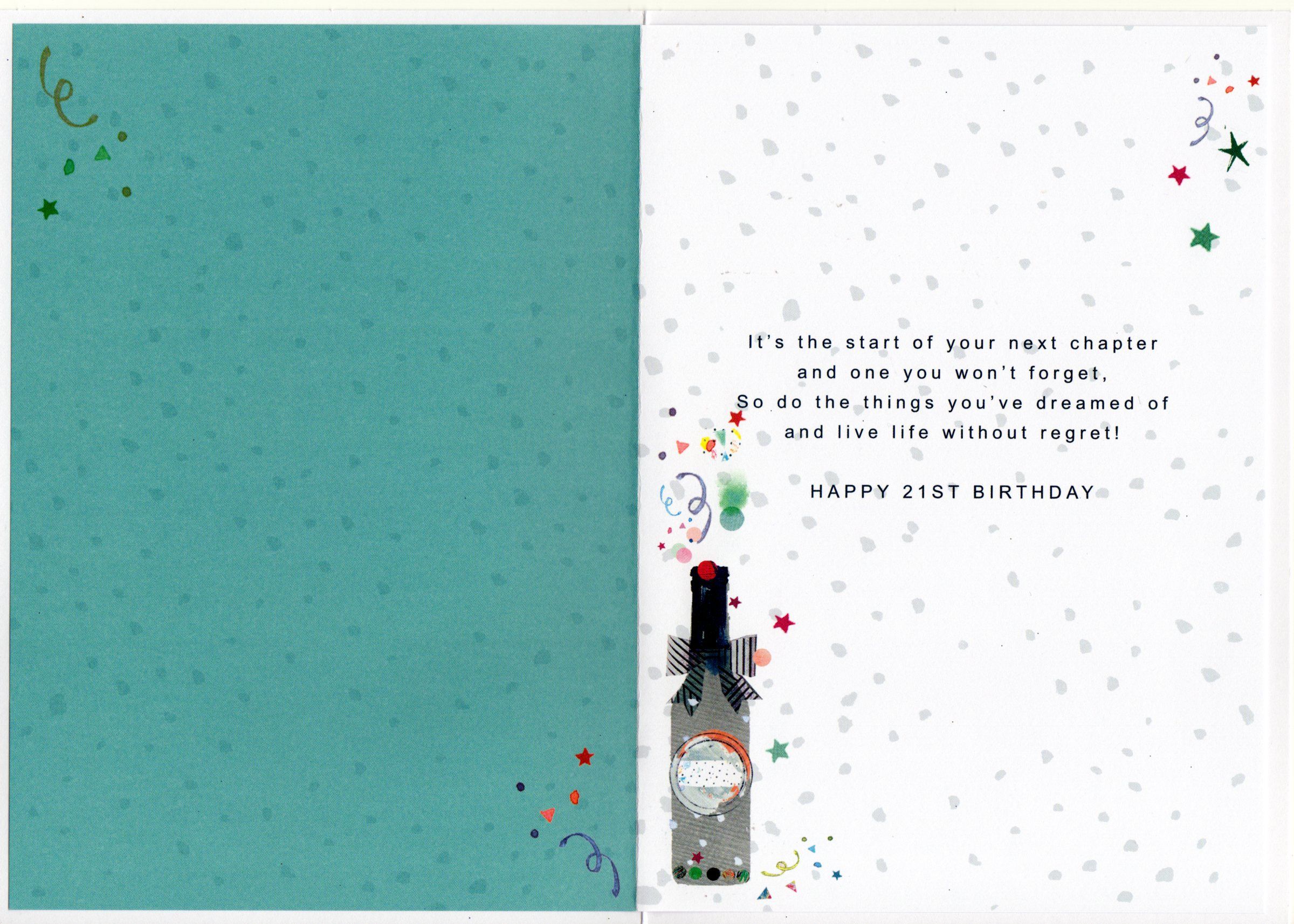 Inside reads: It's the start of your next chapter and one you won't forget, So do the things you've dreamed of and live life without regret! Happy 21st Birthday