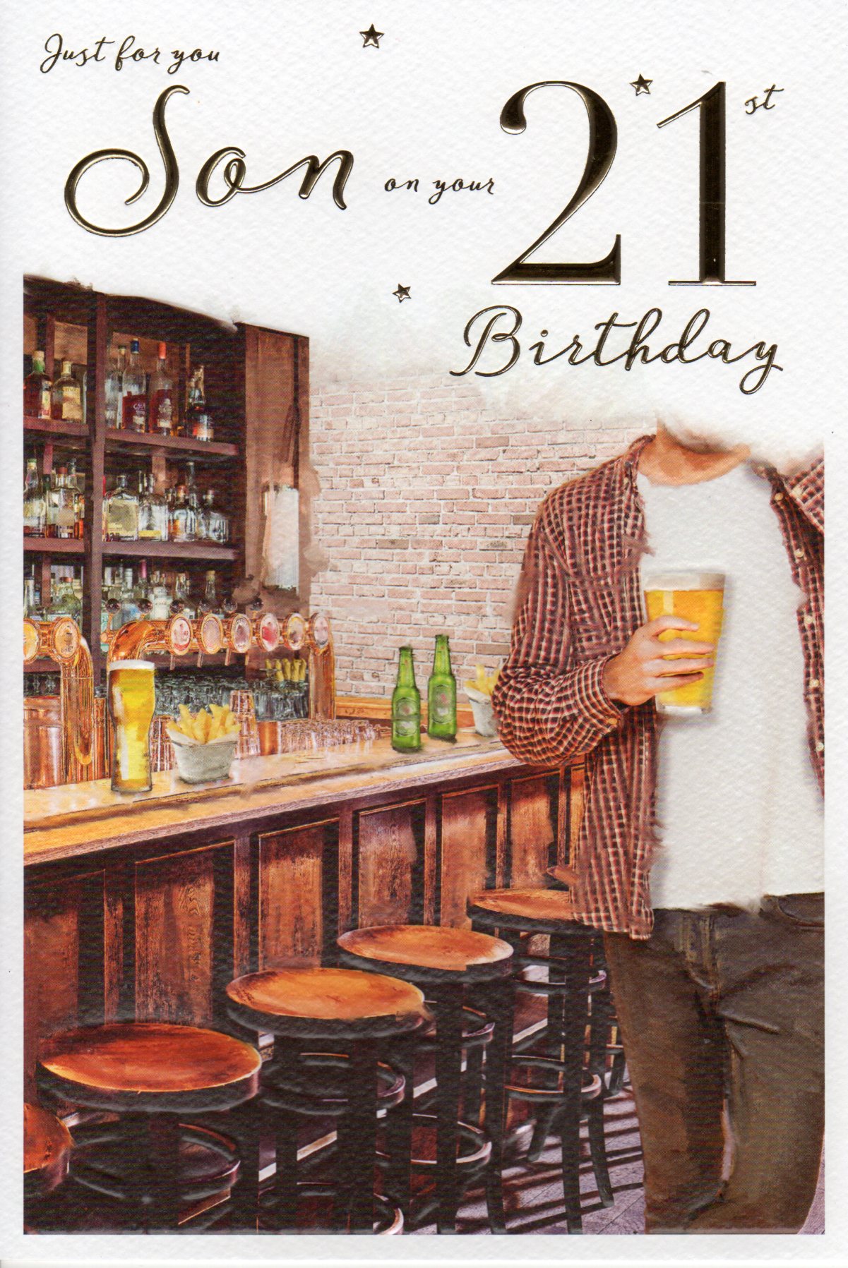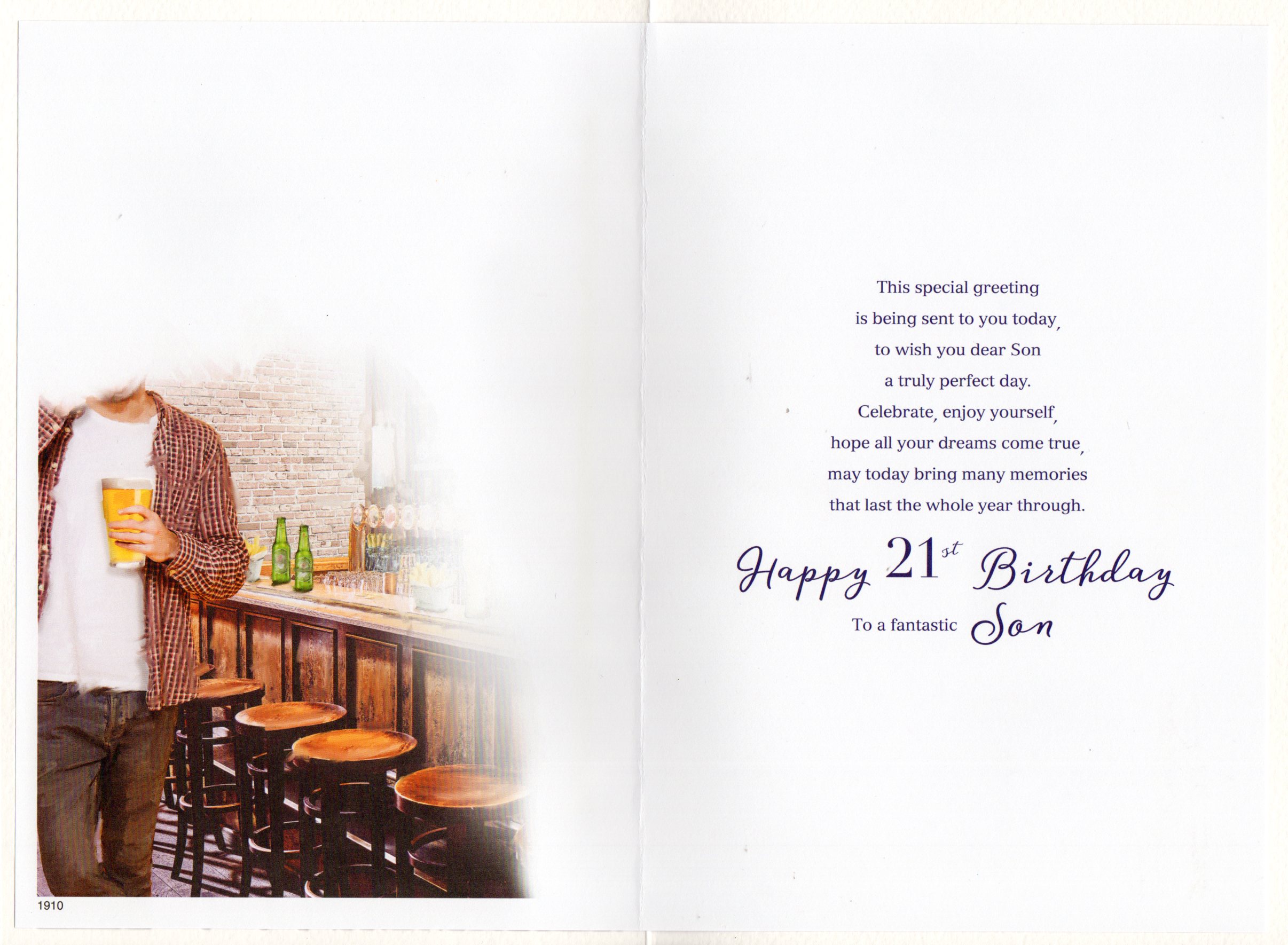 Inside reads: This special greeting is being sent to you today, to wish you dear Son a truly perfect day. Celebrate, enjoy yourself, hope all your dreams come true, may today bring many memories that last the whole year through. Happy 21st Birthday To a fantastic Son