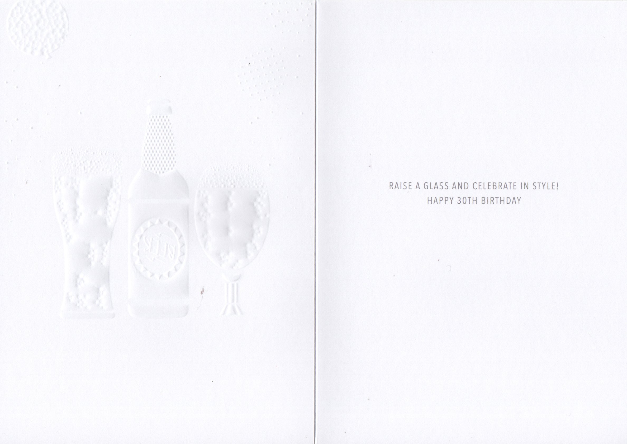 Inside reads: RAISE A GLASS AND CELEBRATE IN STYLE! HAPPY 30TH BIRTHDAY