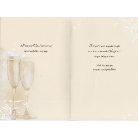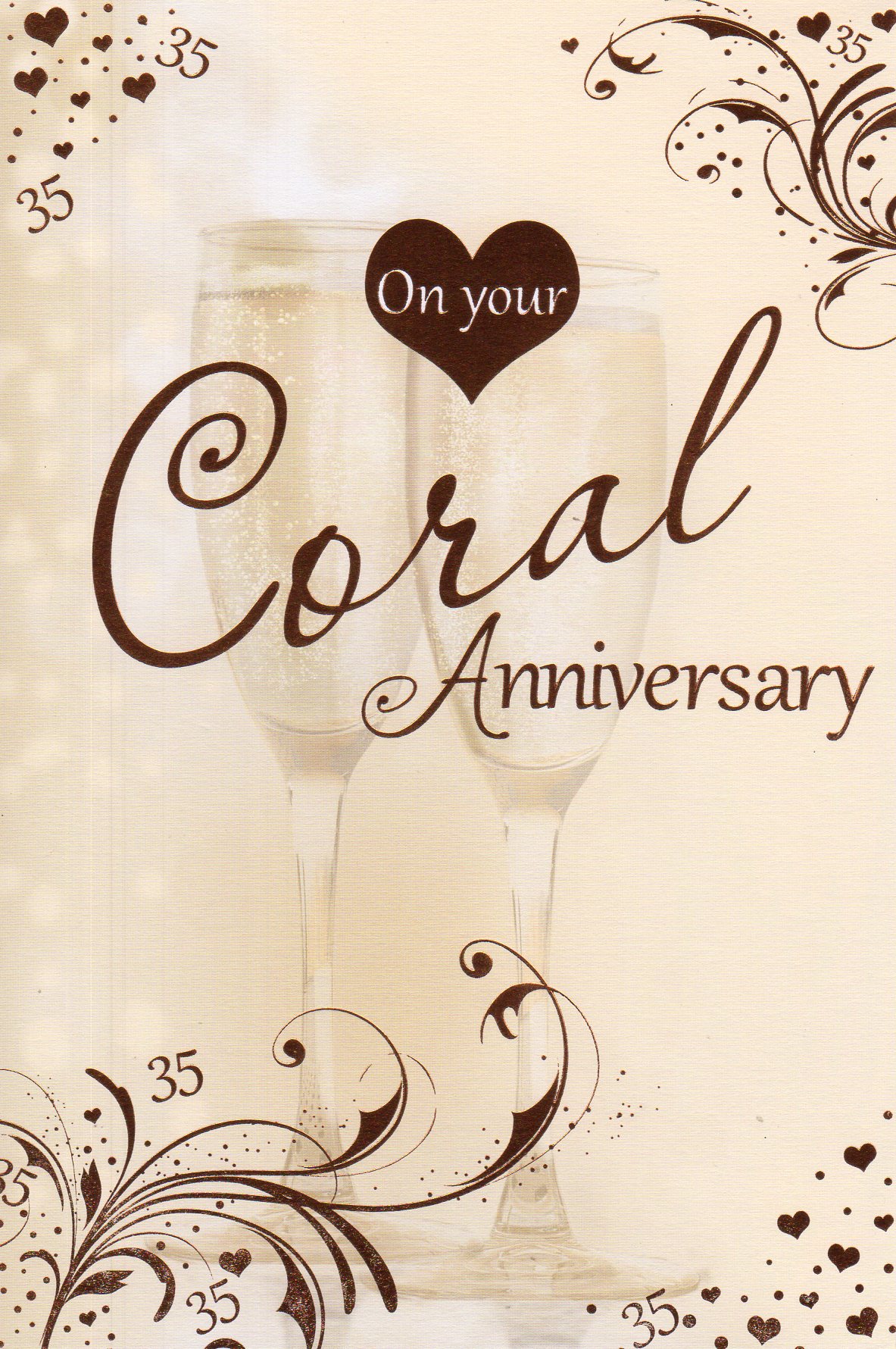 Inside reads: Hope Your Coral Anniversary is wonderful in every way.., For you're such a special couple And deserve as much Happiness As you bring to others. With Best Wished On Your Very Special Day