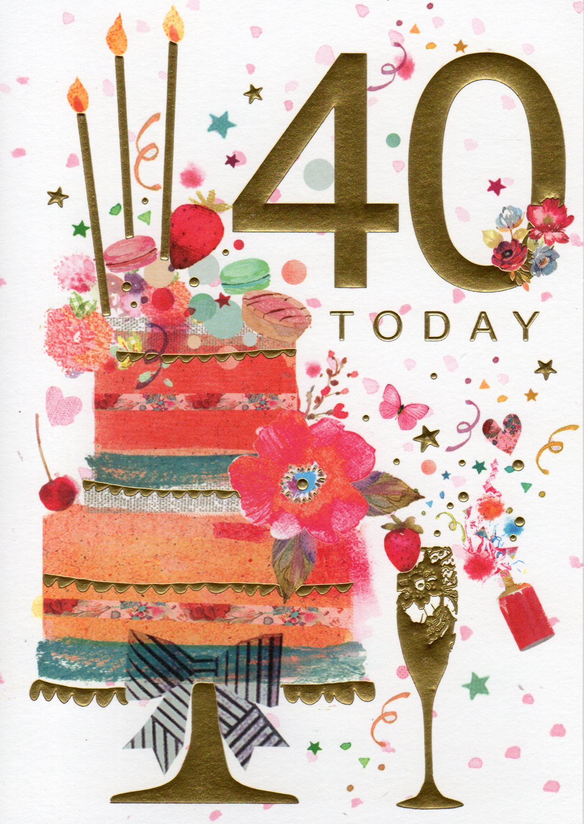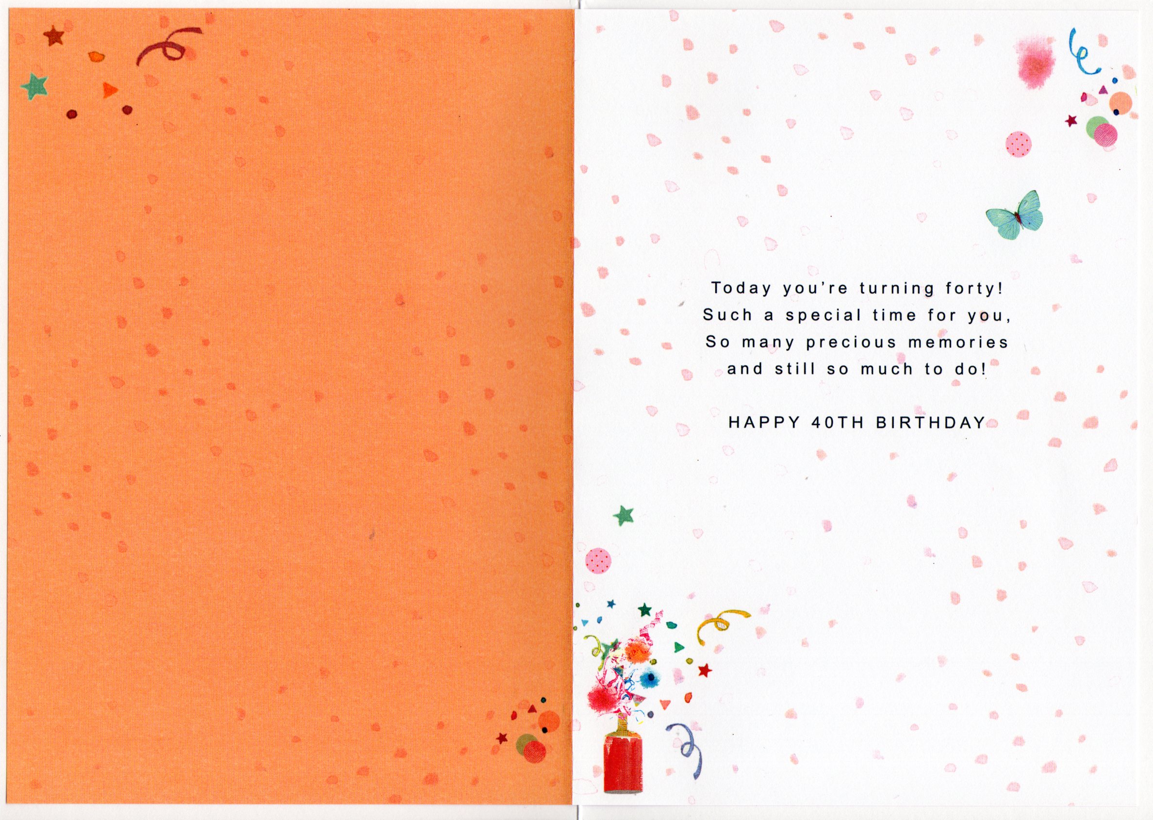 Inside reads: Today you're turning forty! Such a special time for you, So many precious memories and still so much to do! Happy 40th Birthday