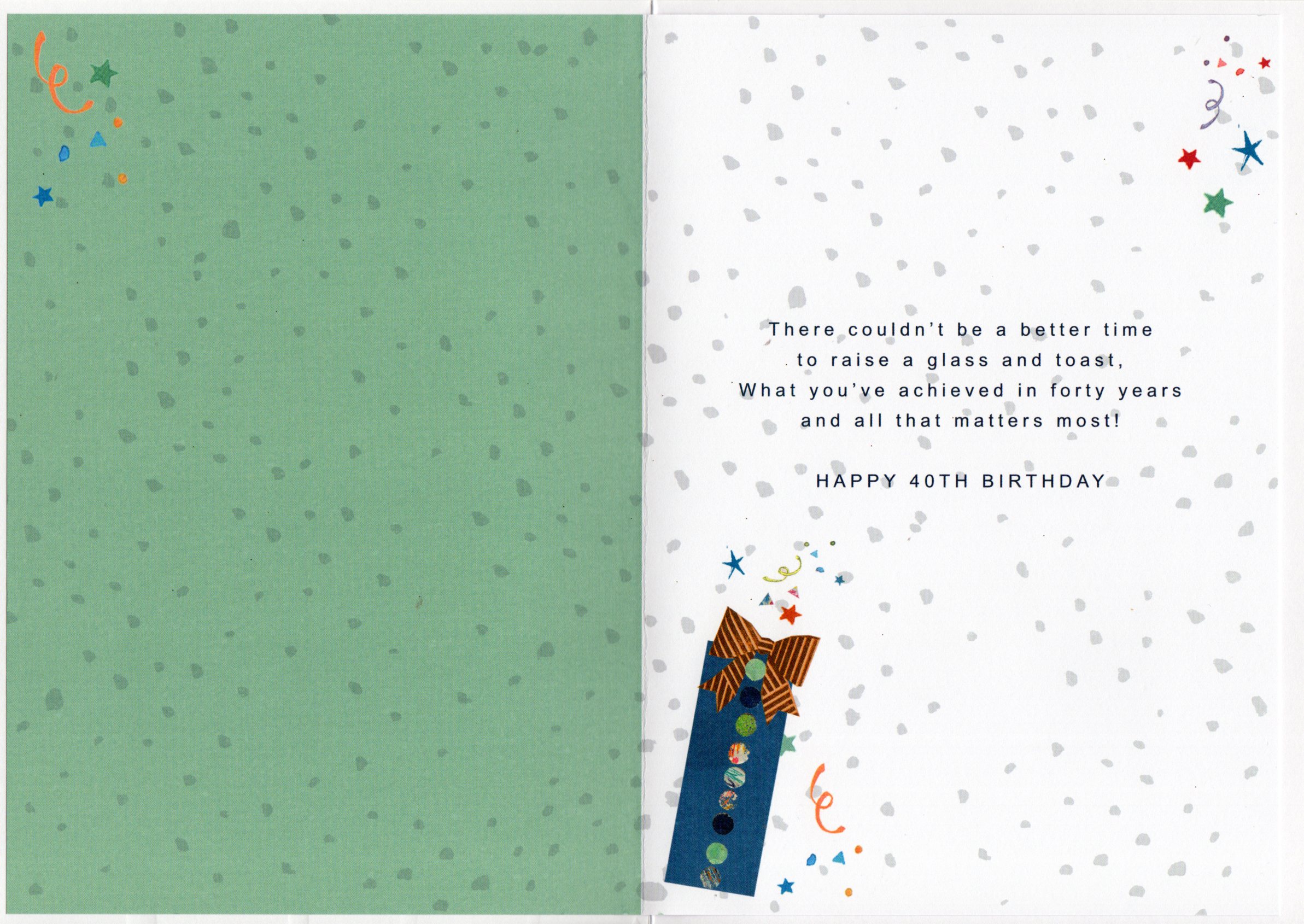 Inside reads: There couldn't be a better time to raise a glass and toast, what you've achieved in forty years and all that matters most! Happy 40th Birthday