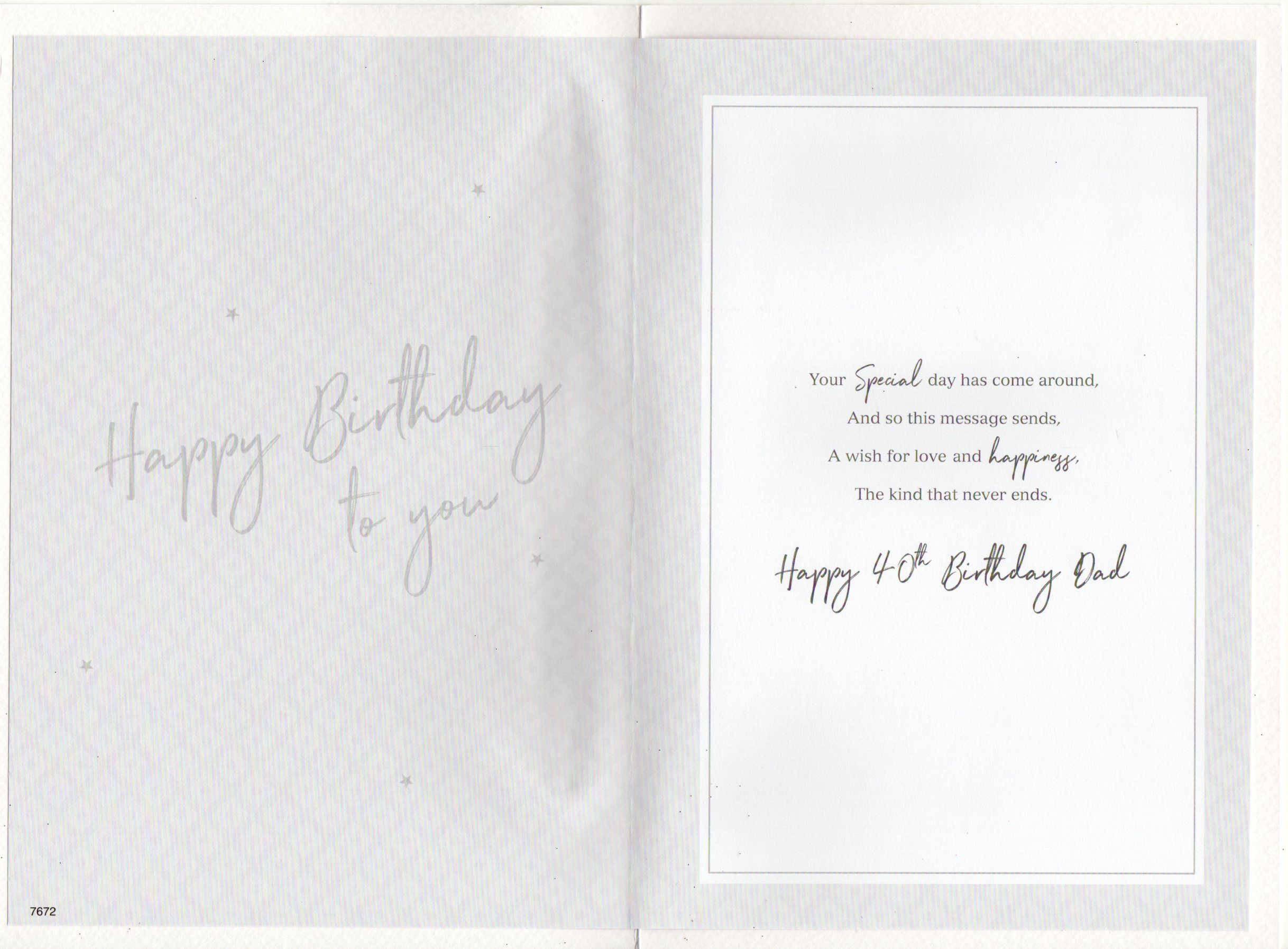 Inside reads: Your special day has come around, And so this message sends, A wish for love and happiness, The kind that never ends. Happy 40th Birthday Dad