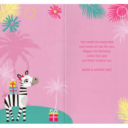 Inside reads: Get ready for surprises and treats all just for you, Happy 4th Birthday, Little Girl and fun-filled wishes, too. Have A Lovely Day