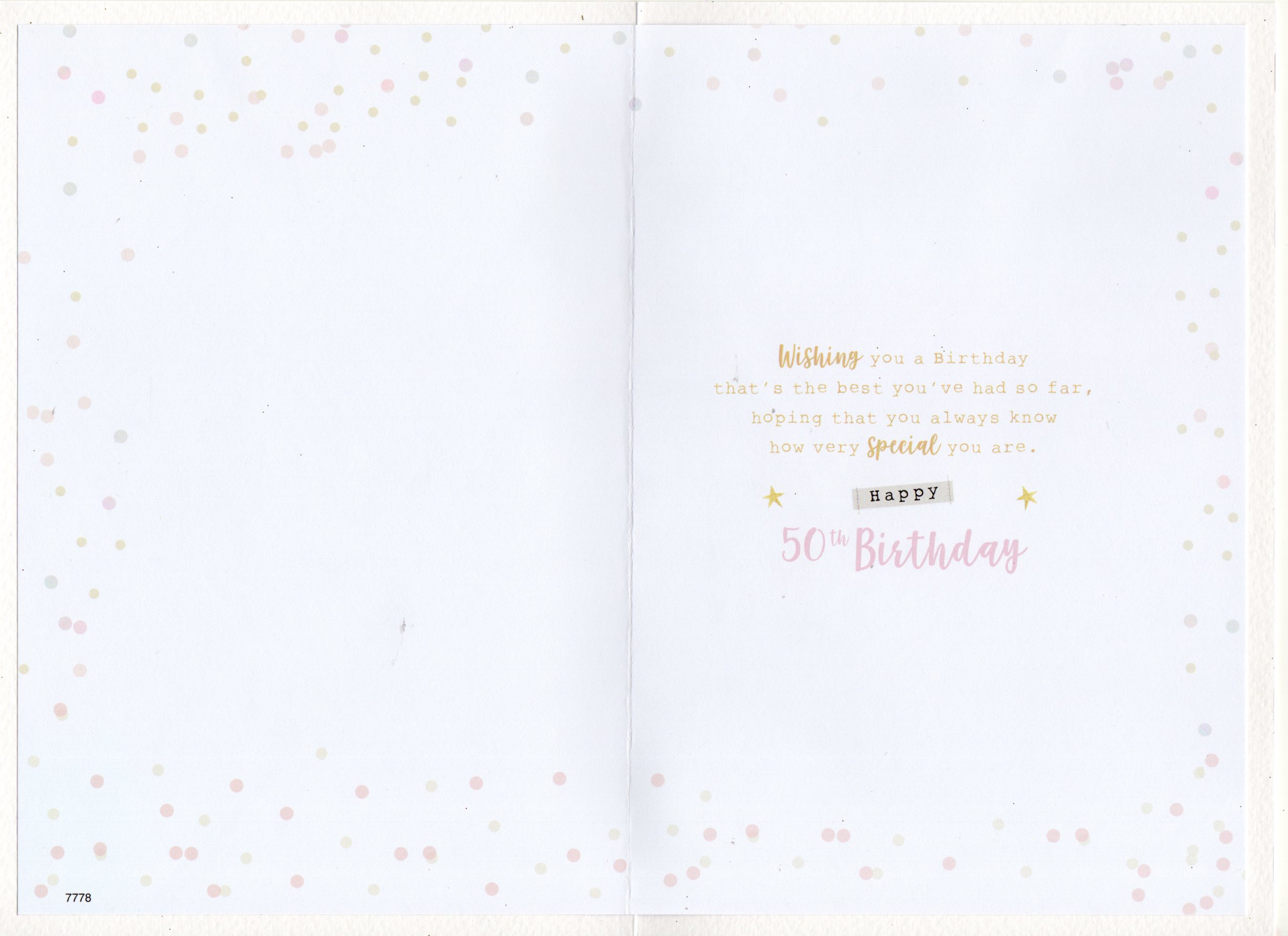 Inside reads: Wishing you a Birthday that's the best you've had so far, hoping that you always know how very special you are. Happy 50th Birthday