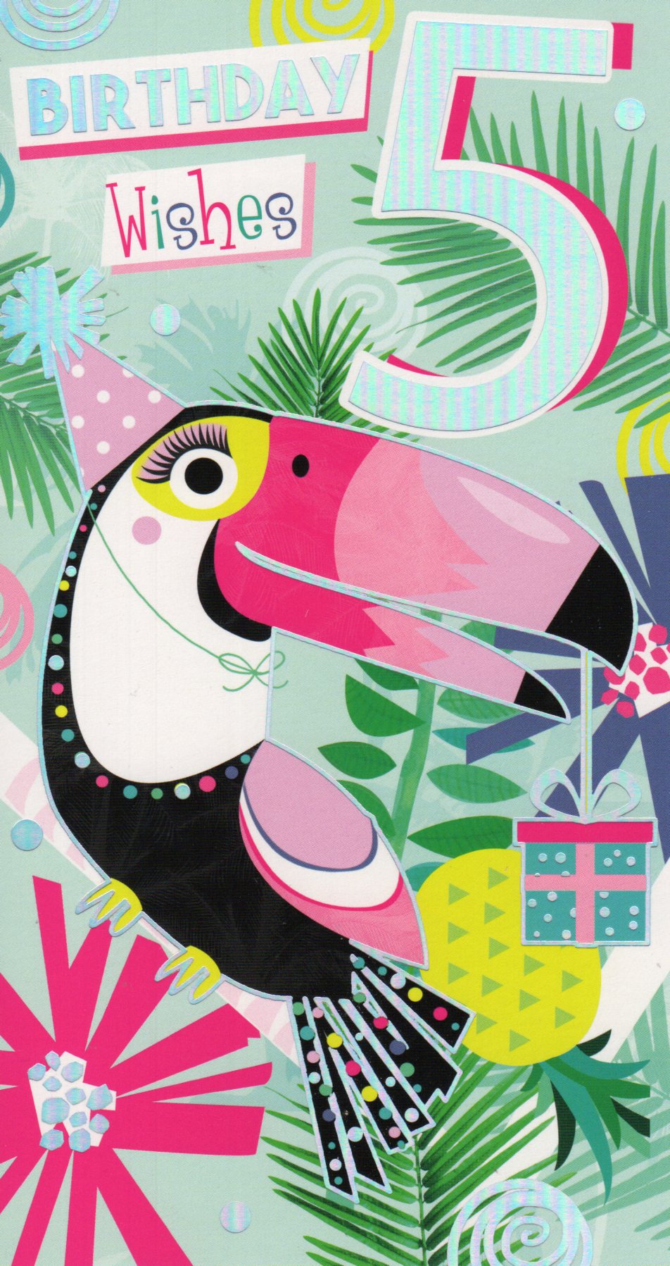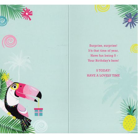 Inside reads: Surprise, surprise! It's that time of year, Have fun being 5 Your Birthday's here! 5 Today! Have A Lovely Time