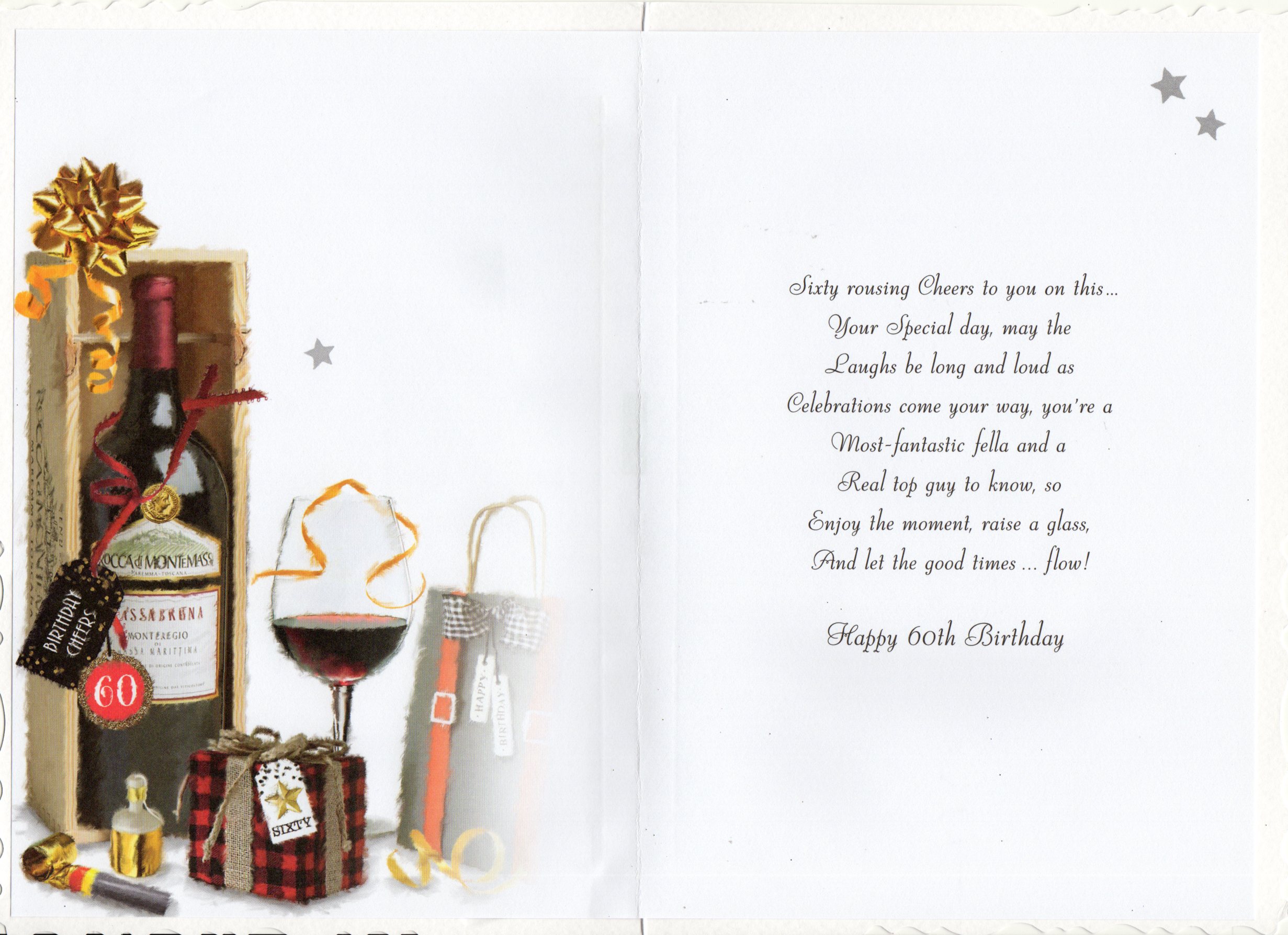 Inside reads: Sixty rousing cheers to you on this... your special day, may the laughs be long and loud as celebrations come your way, you're a most-fantastic fella and a real top guy to know, so enjoy the moment, raise a glass, and let the good times... flow! Happy 60th Birthday