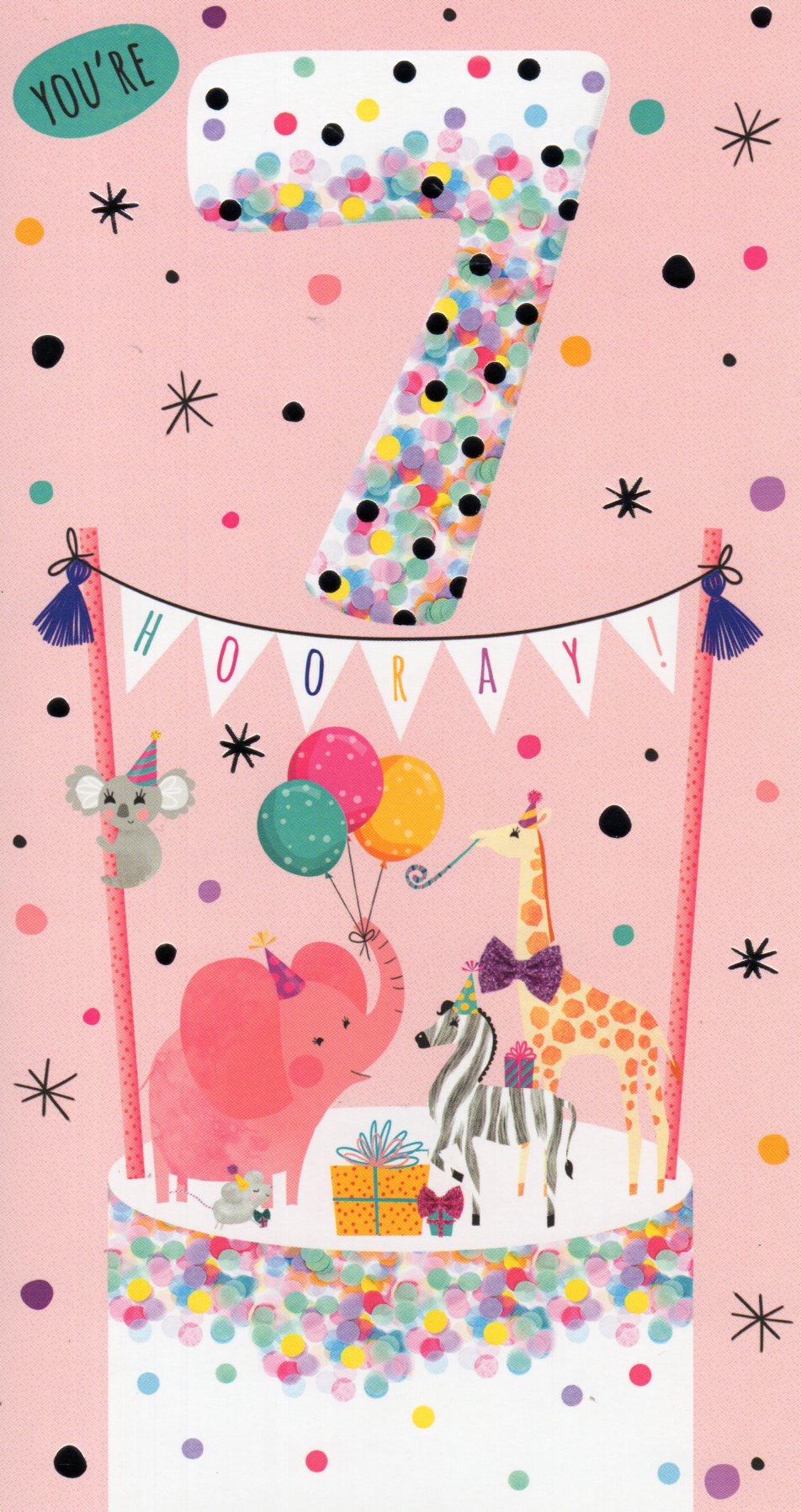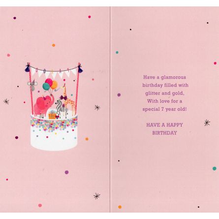 Inside reads: Have a glamorous birthday filled with glitter and gold, With love for a special 7 year old! Have A Happy Birthday