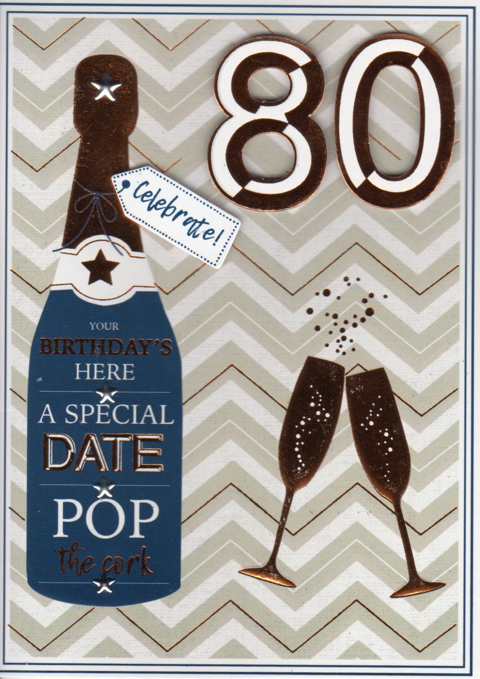 On the front the card reads: 80..., celebrate! Your Birthday's Here A Special Date Pop the cork.