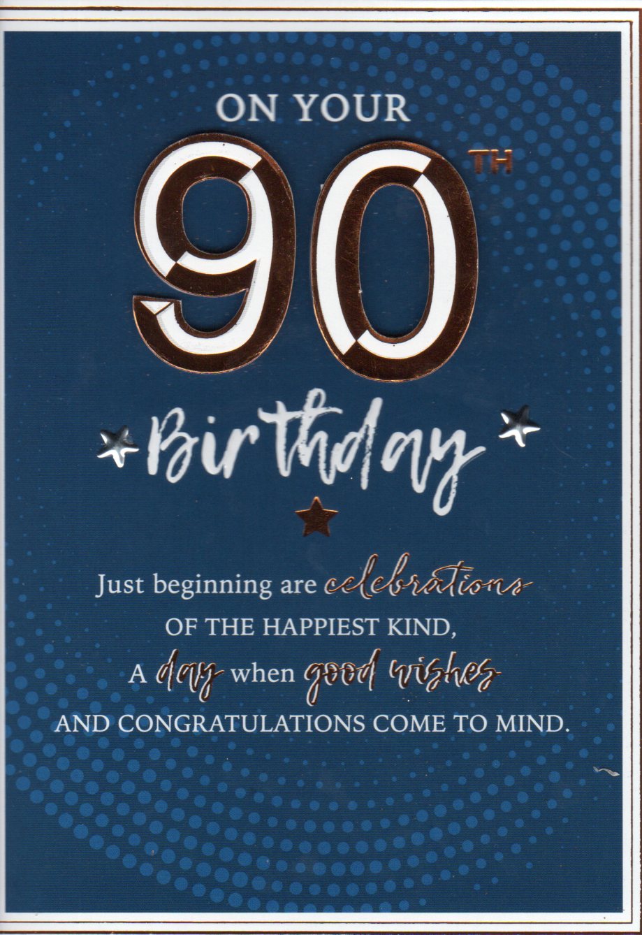 On the front the card reads: On Your 90 Birthday, Just beginning are celebrations Of the Happiest Kind, A day when good wishes and congratulations come to mind.