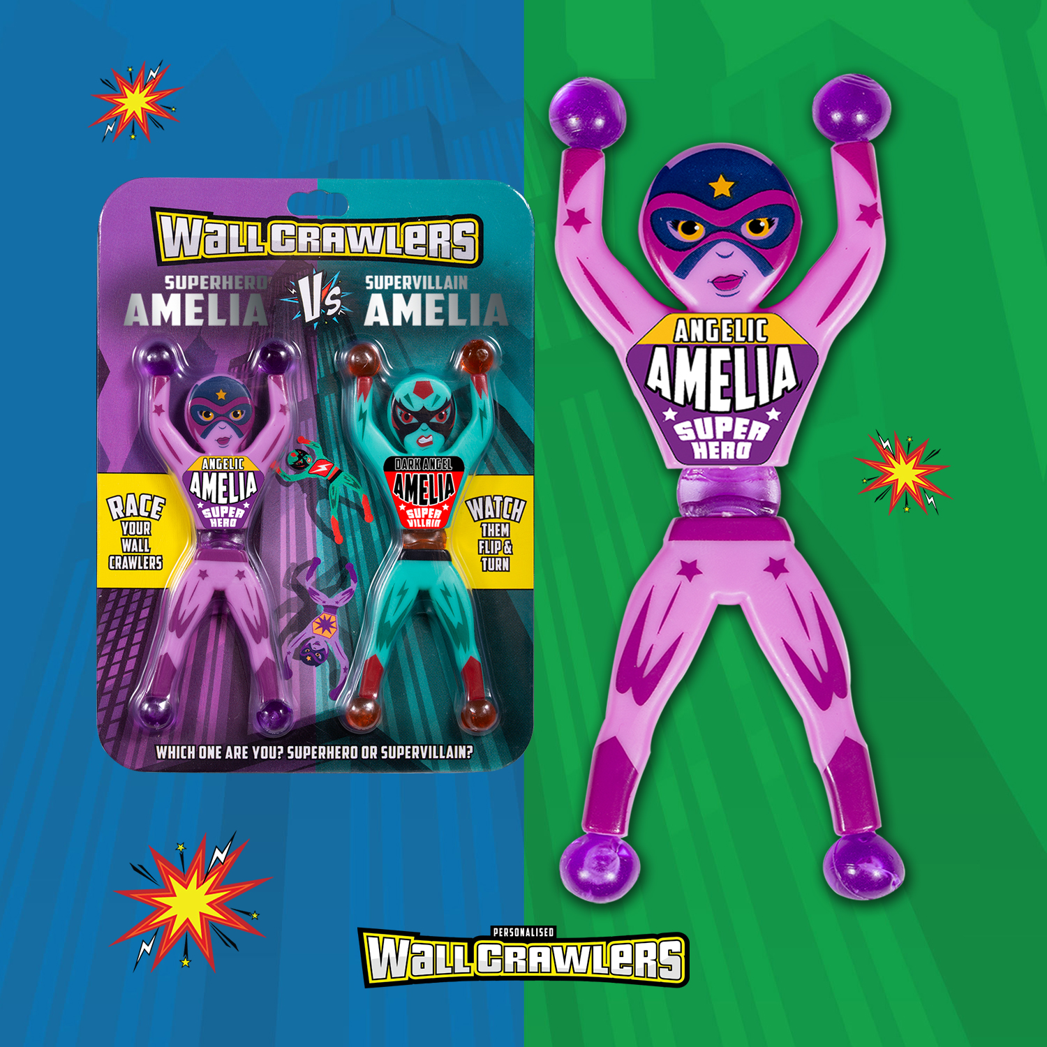 Throw your superhero and supervillain Wall Crawlers at a smooth vertical surface- try a wall, window or even bathroom tiles and see a super race in action!