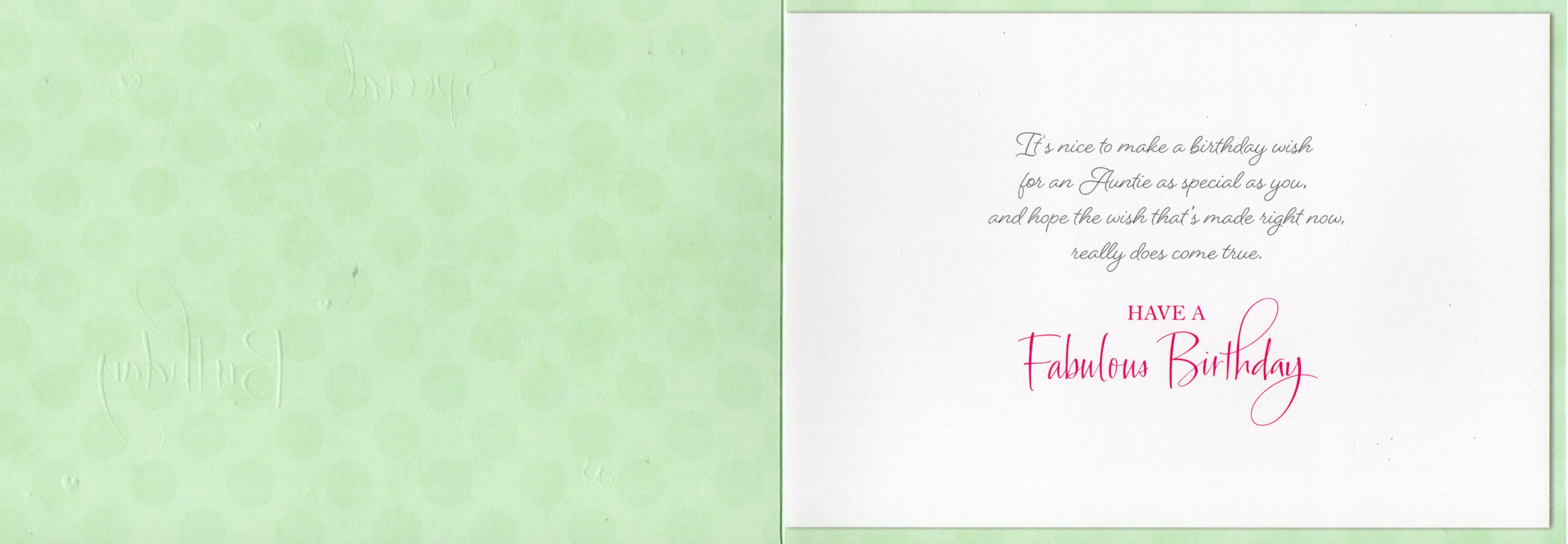 Inside reads: It's nice to make a Birthday wish for an Auntie as special as you, and hope the wish that's made right now, really dose come true. Have A Fabulous Birthday
