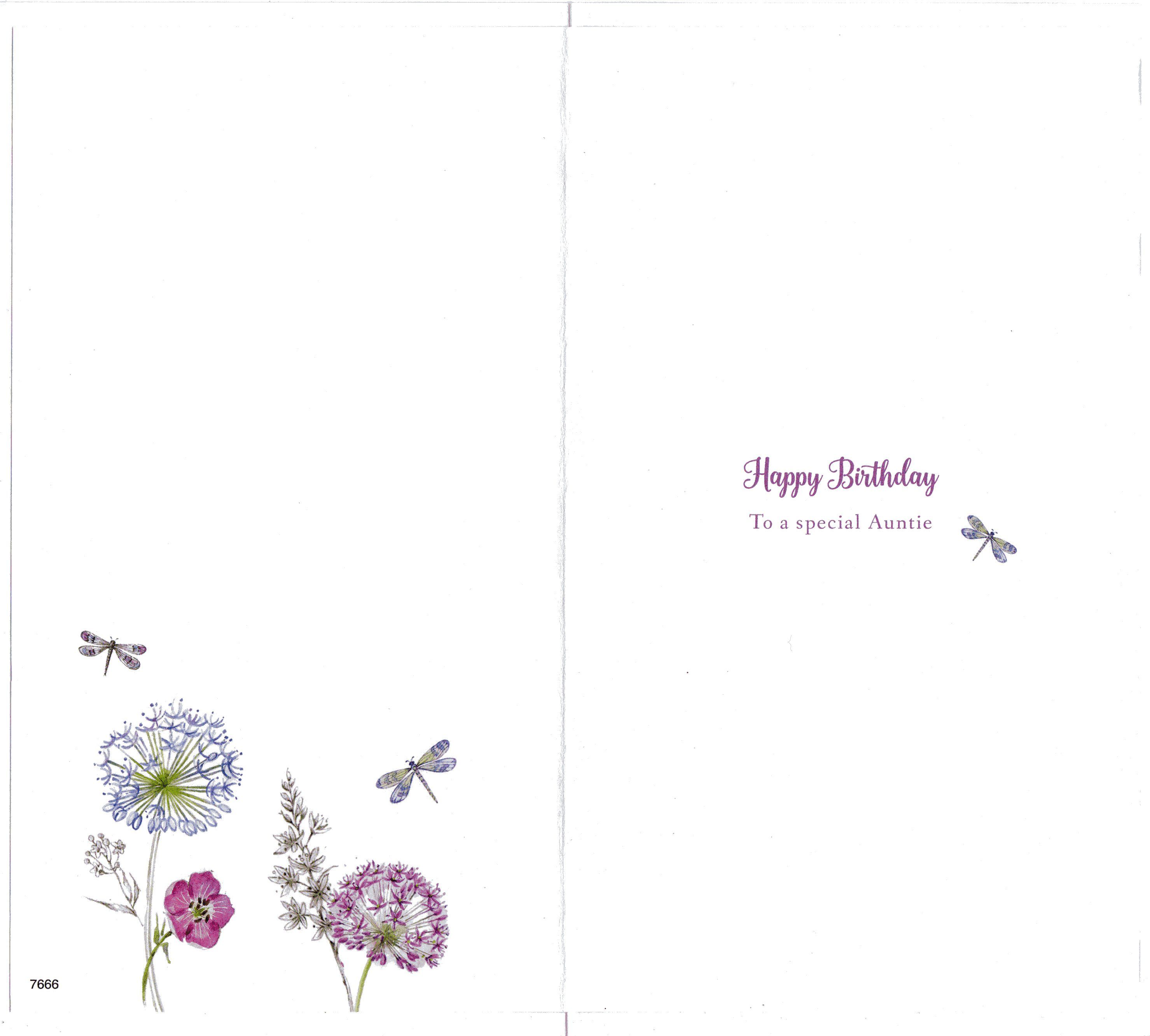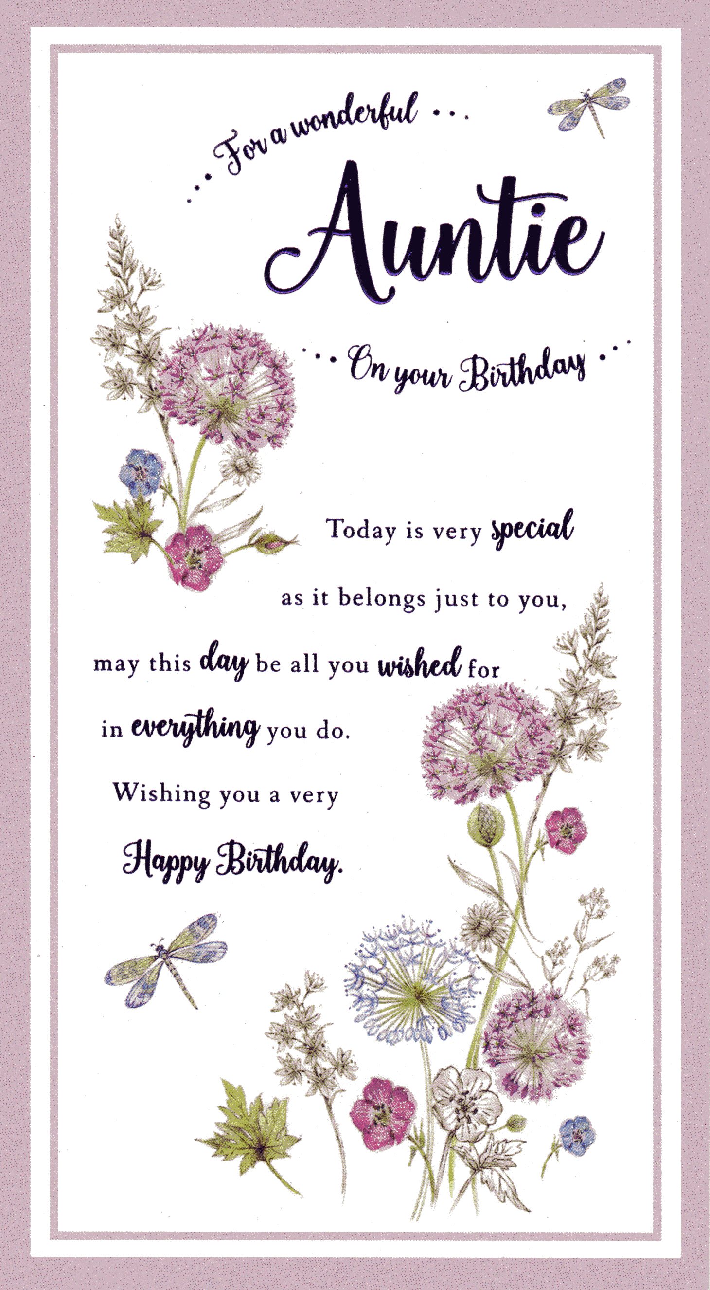 On the front the card reads: For a wonderful Auntie on your Birthday Today is very special as it belongs just you, may this day be all you wished for in everything you do. Wishing you a very Happy Birthday.