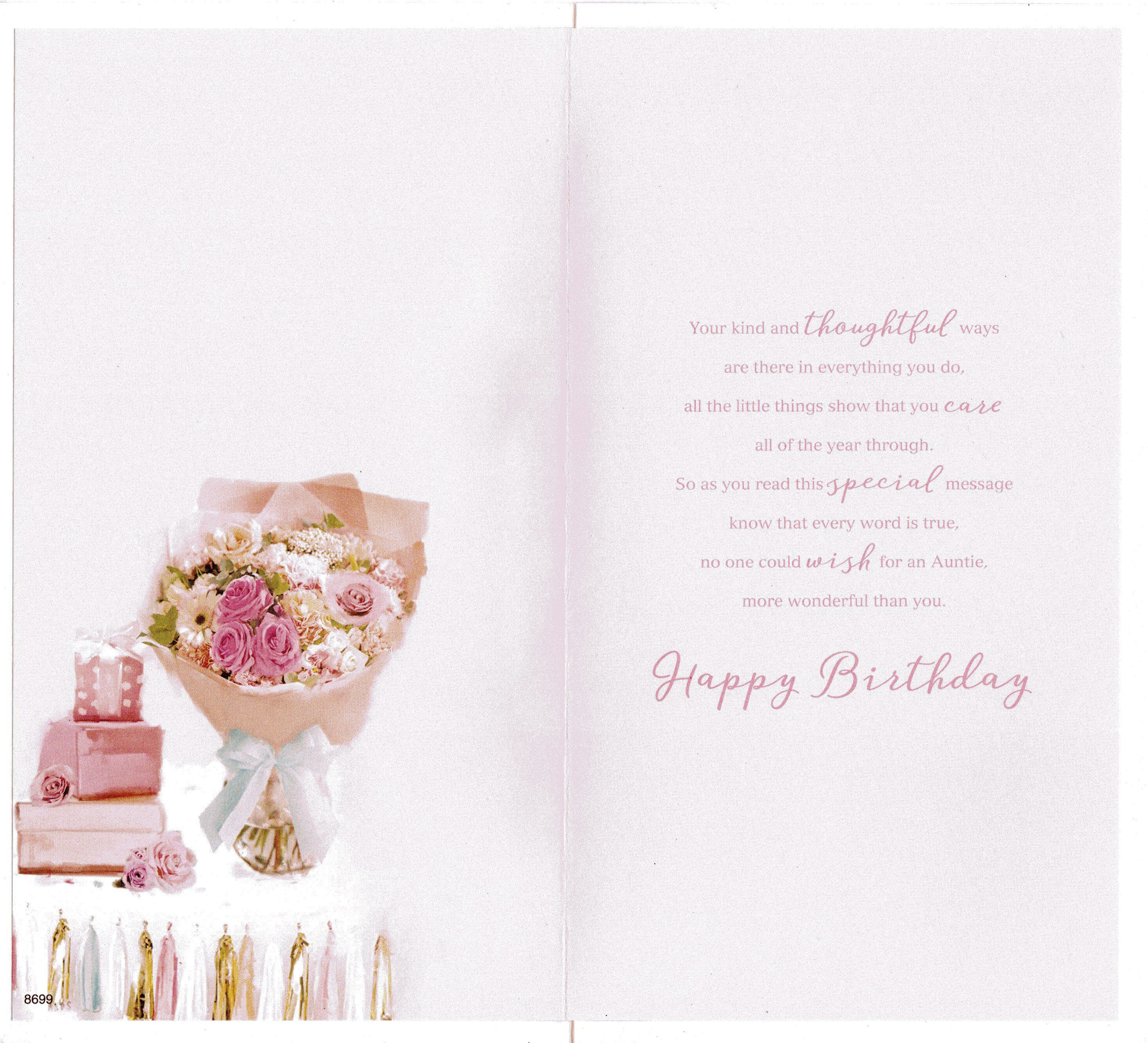 Inside reads: Your kind and thoughtful ways are there in everything you do, all the little things show that you care all of the year through. So as you read this special message know that every word is true, no one could wish for an Auntie, more wonderful than you. Happy Birthday