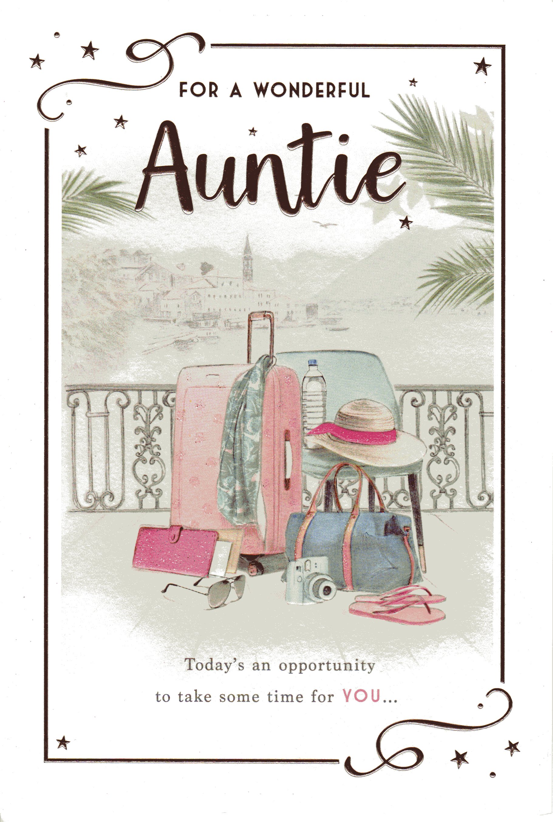On the front the card reads: For A Wonderful Auntie Today's an opportunity to take some time for you...
