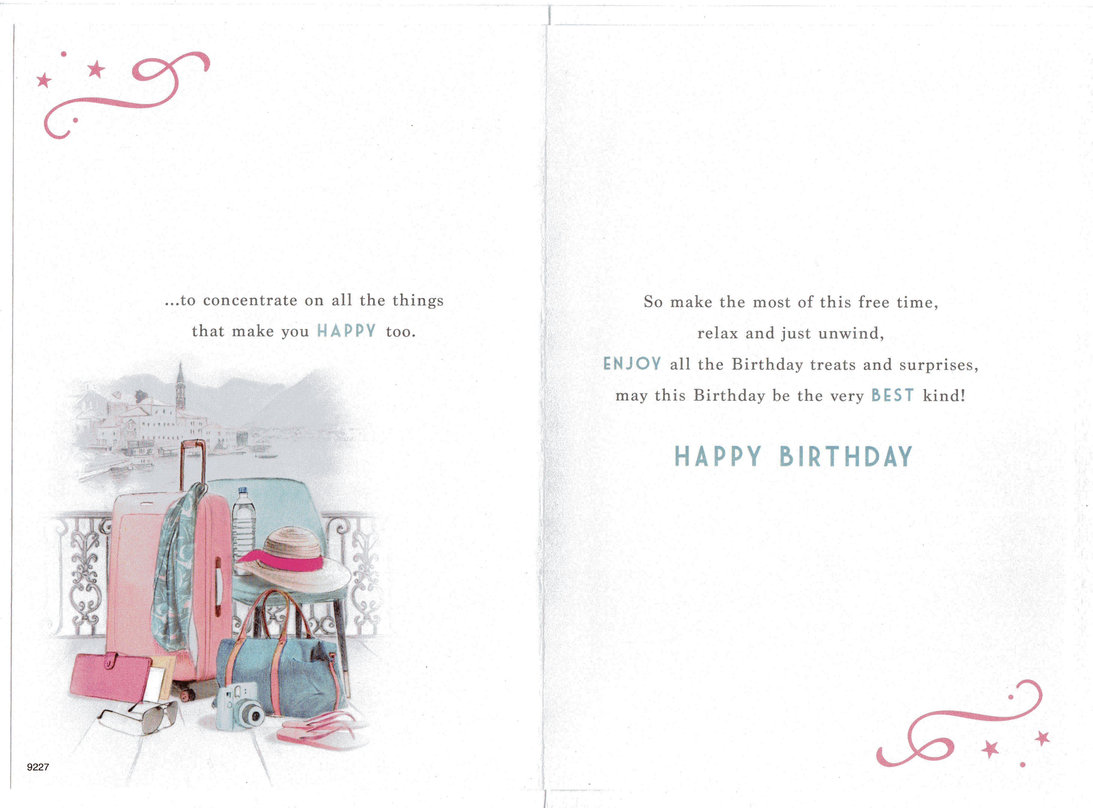 Inside reads: ...to concentrate on all the things that make you Happy too. So make the most of this free time, relax and just unwind, Enjoy all the Birthday treats and surprises, may this Birthday be the very Best kind! Happy Birthday