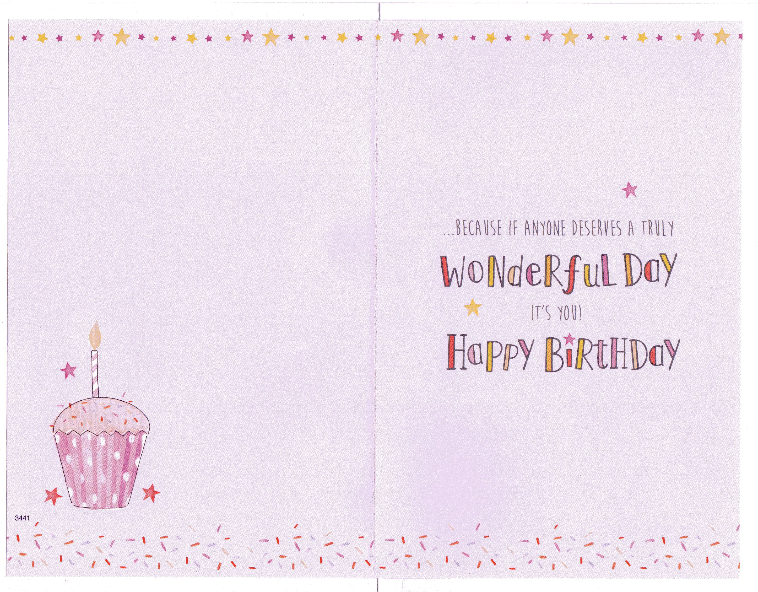 Inside reads: ...Because if anyone deserves a truly Wonderful Day it's you! Happy Birthday.