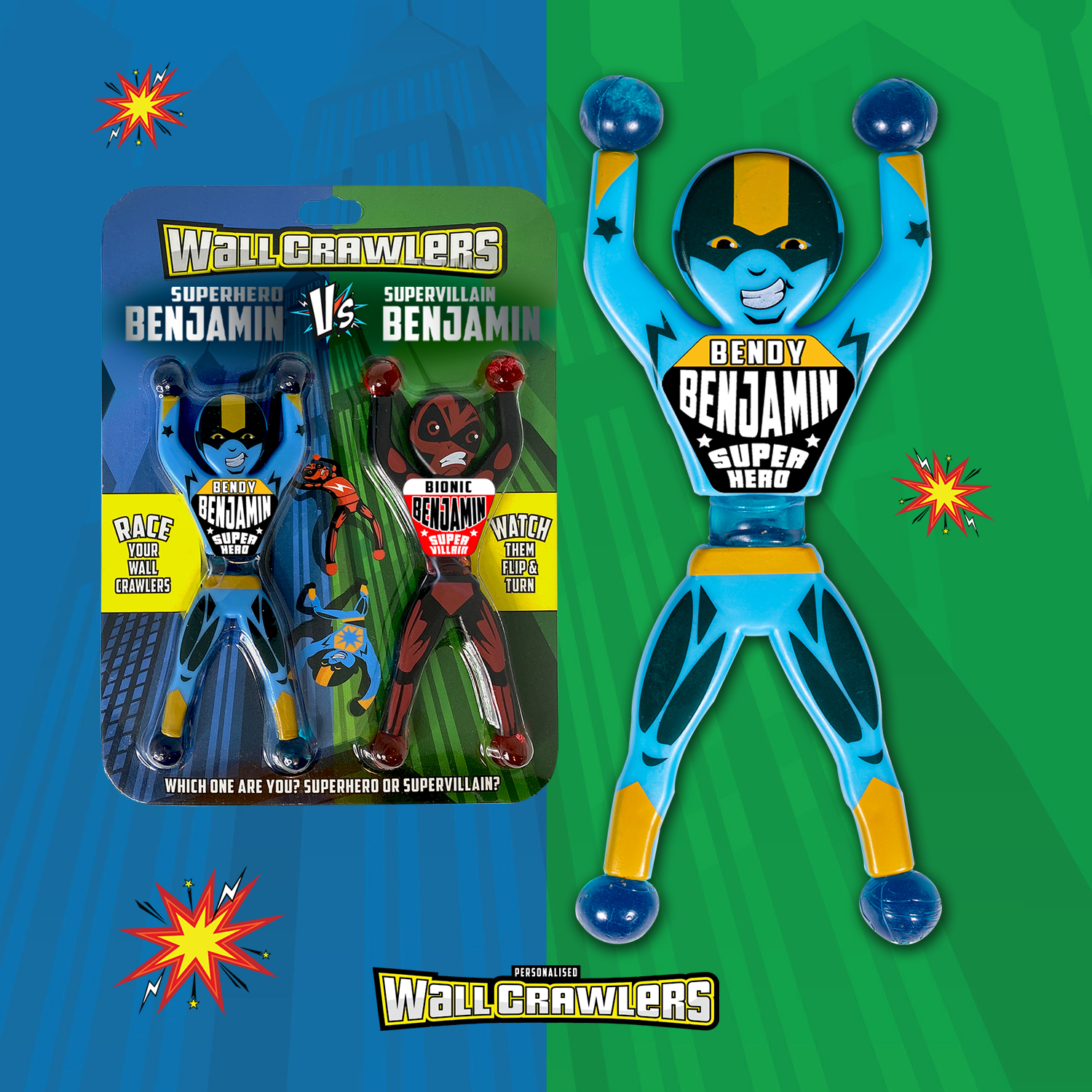 Throw your superhero and supervillain Wall Crawlers at a smooth vertical surface- try a wall, window or even bathroom tiles and see a super race in action!