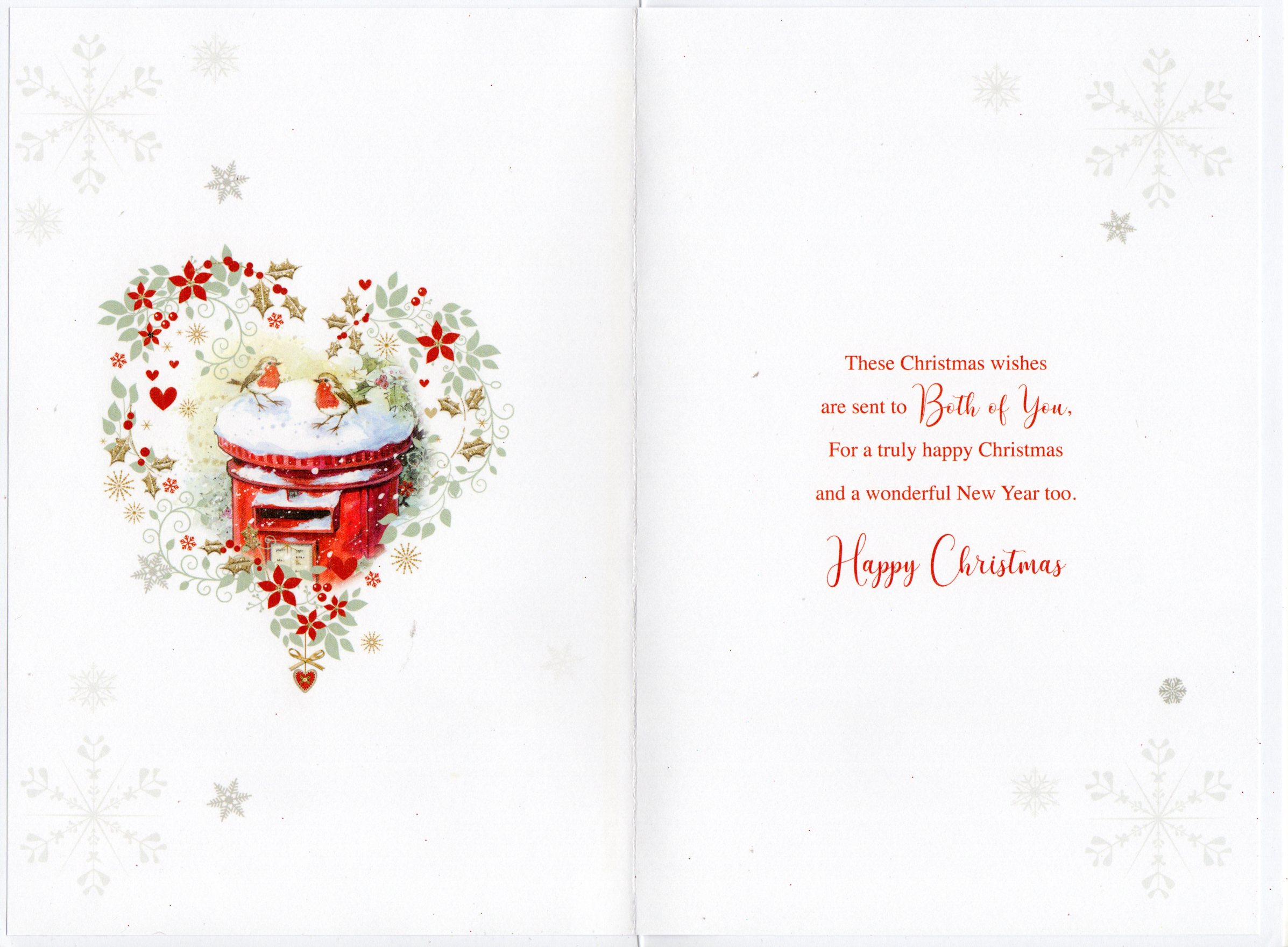 Inside reads: These Christmas wishes are sent to Both Of You, For a truly happy Christmas and a wonderful New Year too. Happy Christmas