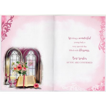 Inside reads: Wishing a wonderful young lady a very special day filled with blessings. Best Wishes As You Are Confirmed