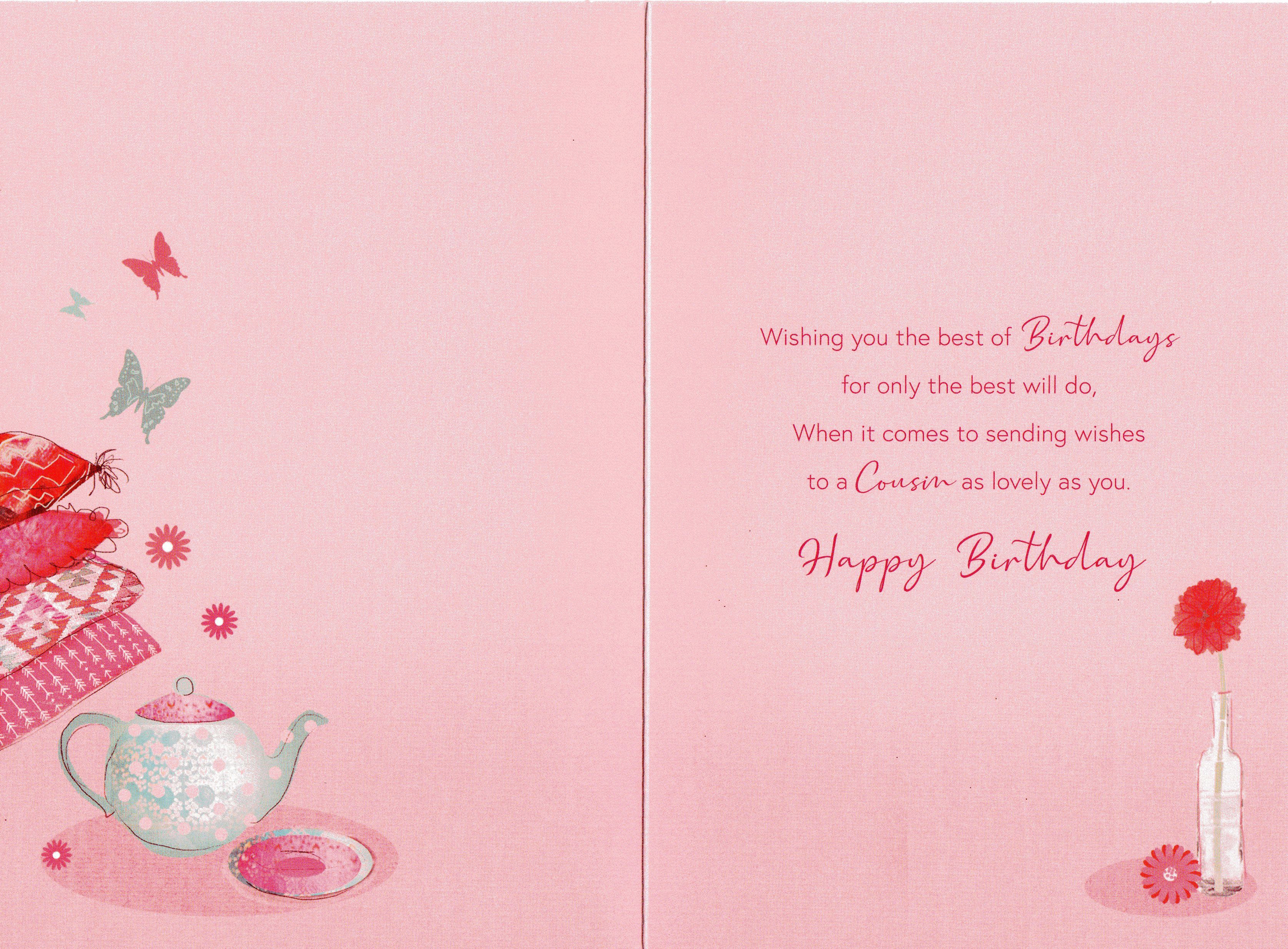 Inside reads: Wishing you the best of Birthdays for only the best will do, when it comes to sending wishes to a Cousin as lovely as you. Happy Birthday