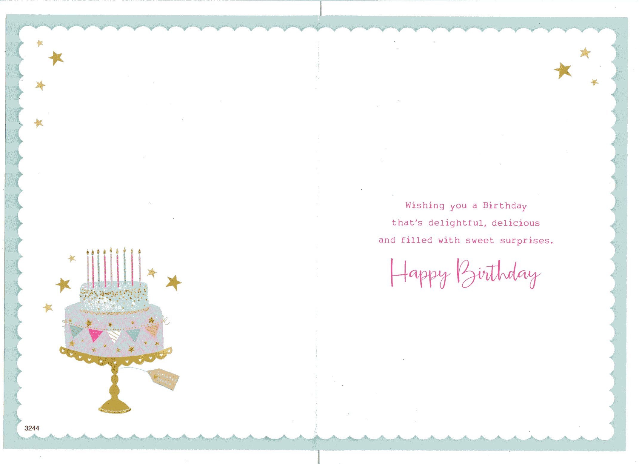 Inside reads: wising you a Birthday that's delightful, delicious and filled with sweet surprises. Happy Birthday
