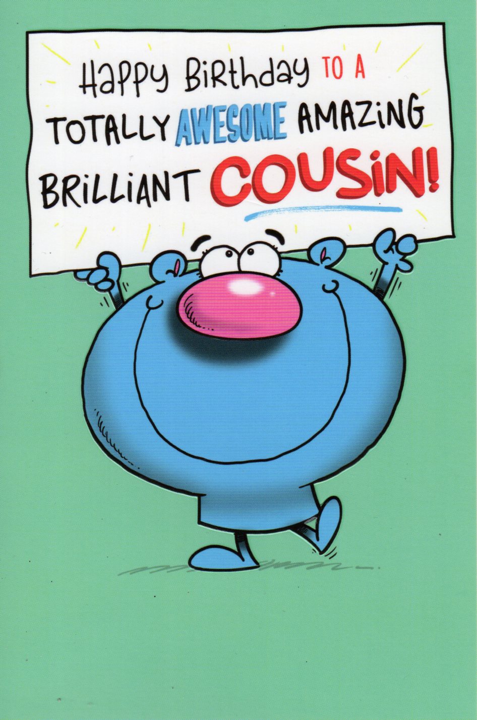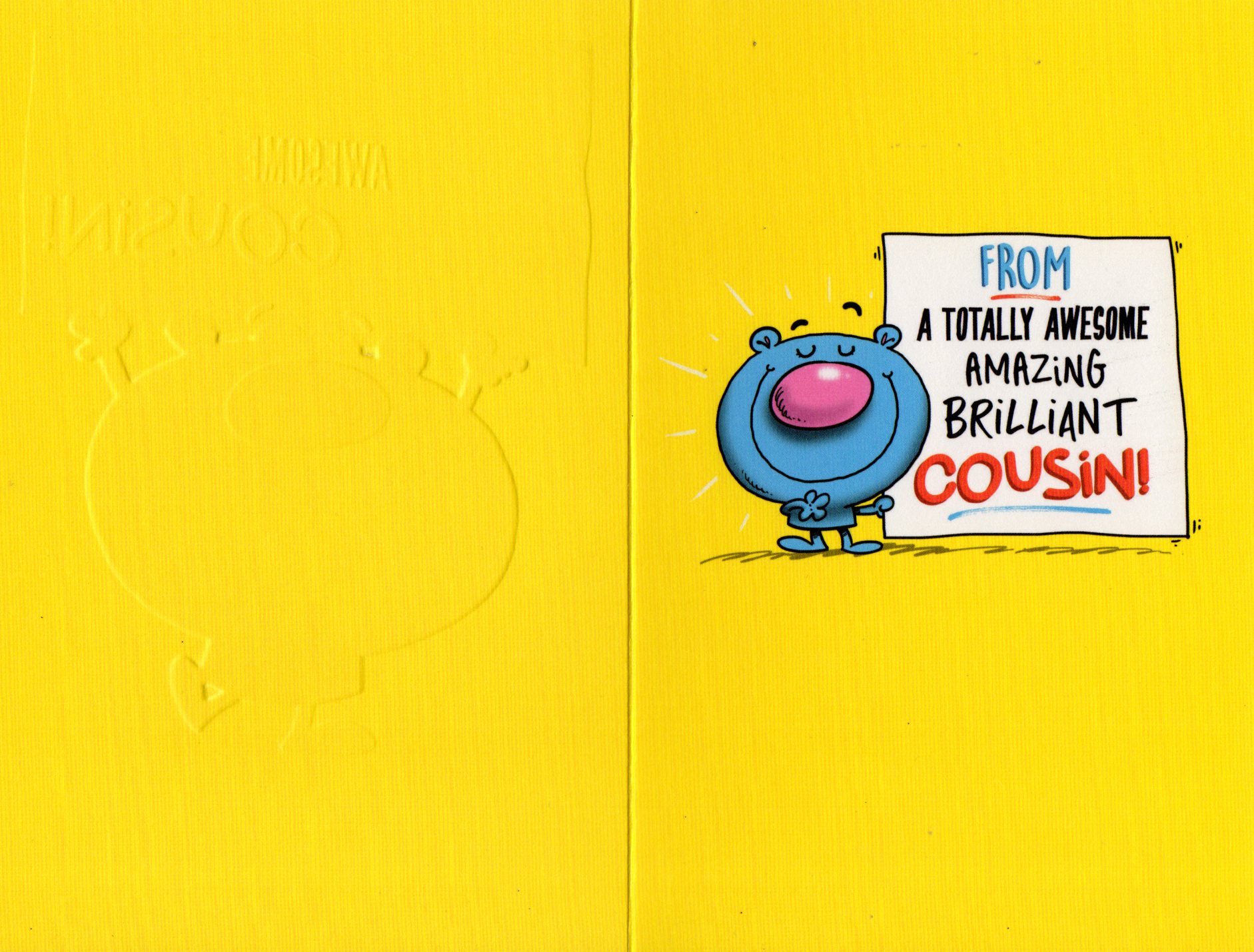 On the front the card reads: Happy Birthday to a totally Awesome amazing brilliant Cousin!