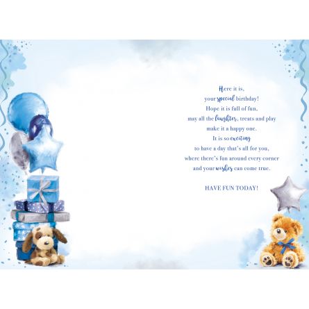 Inside reads: Here it is, your special birthday! Hope it is full of fun, may all the laughter, treats and play make it happy one. It is so exciting to have a day that's all for you, where there's fun around every corner and your wishes can come true. Have Fun Today!