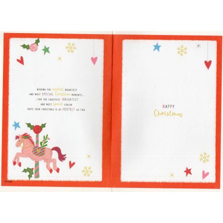 Inside reads: Wishing The Sweetest Brightest And Most Special Christmas Moments... ...For The sweetest. Brightest And Most Special Cousin Hope Your Christmas Is As Perfect As You. Happy Christmas