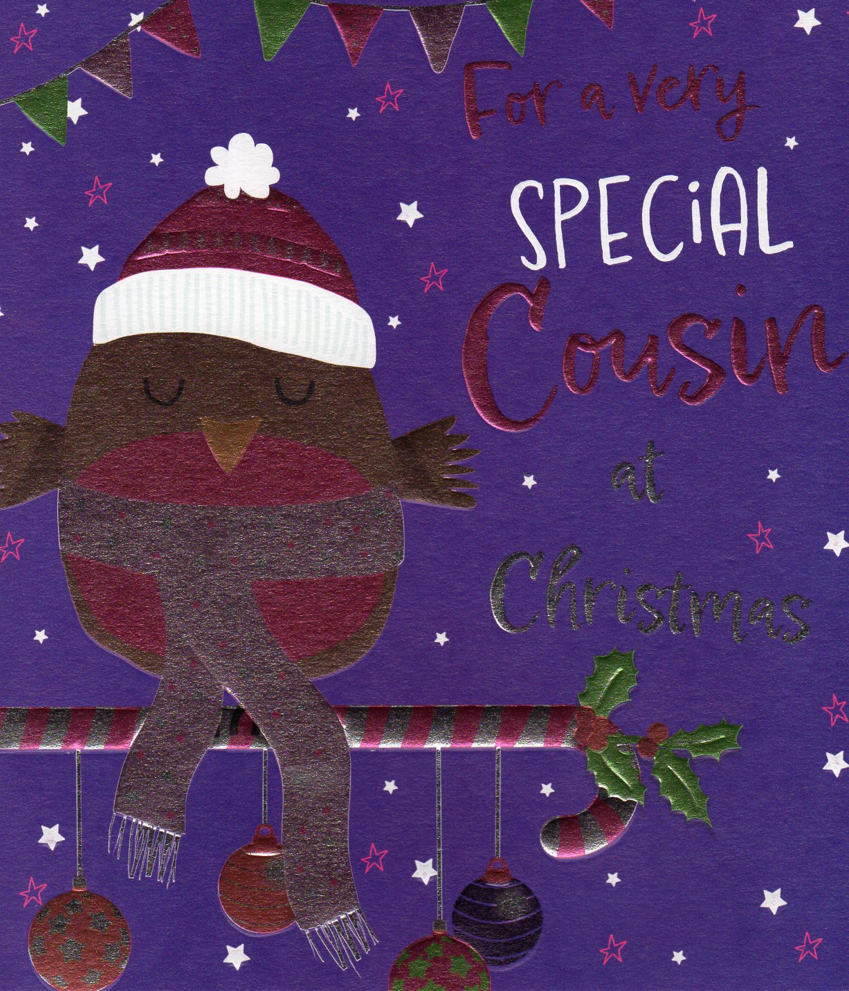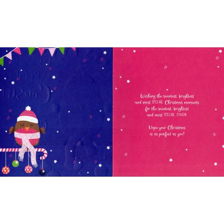 Inside reads: Wishing the sweetest, brightest and most special Christmas moments for the sweetest, brightest and most special Cousin. Hope Your Christmas Is As Perfect As You!