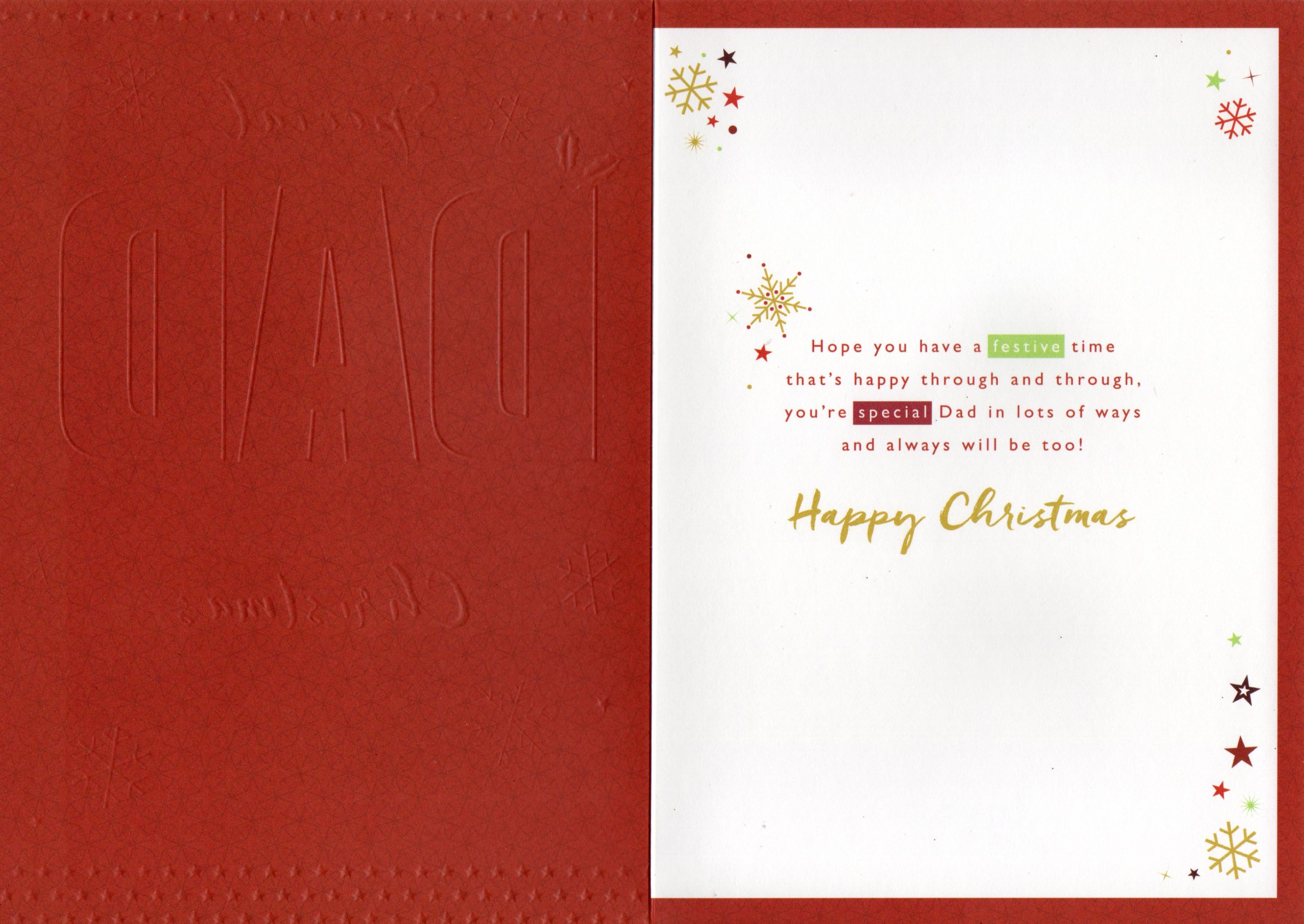 Inside reads: Hope you have a festive time that's happy through and through, you're special Dad in lots of ways and always will be too! Happy Christmas