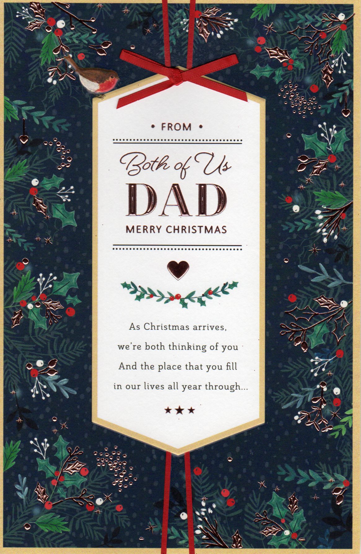 On the front the card reads: From Both of Us Dad merry Christmas, As Christmas arrives, we're both thinking of you And the place that you fill in our lives all year through...