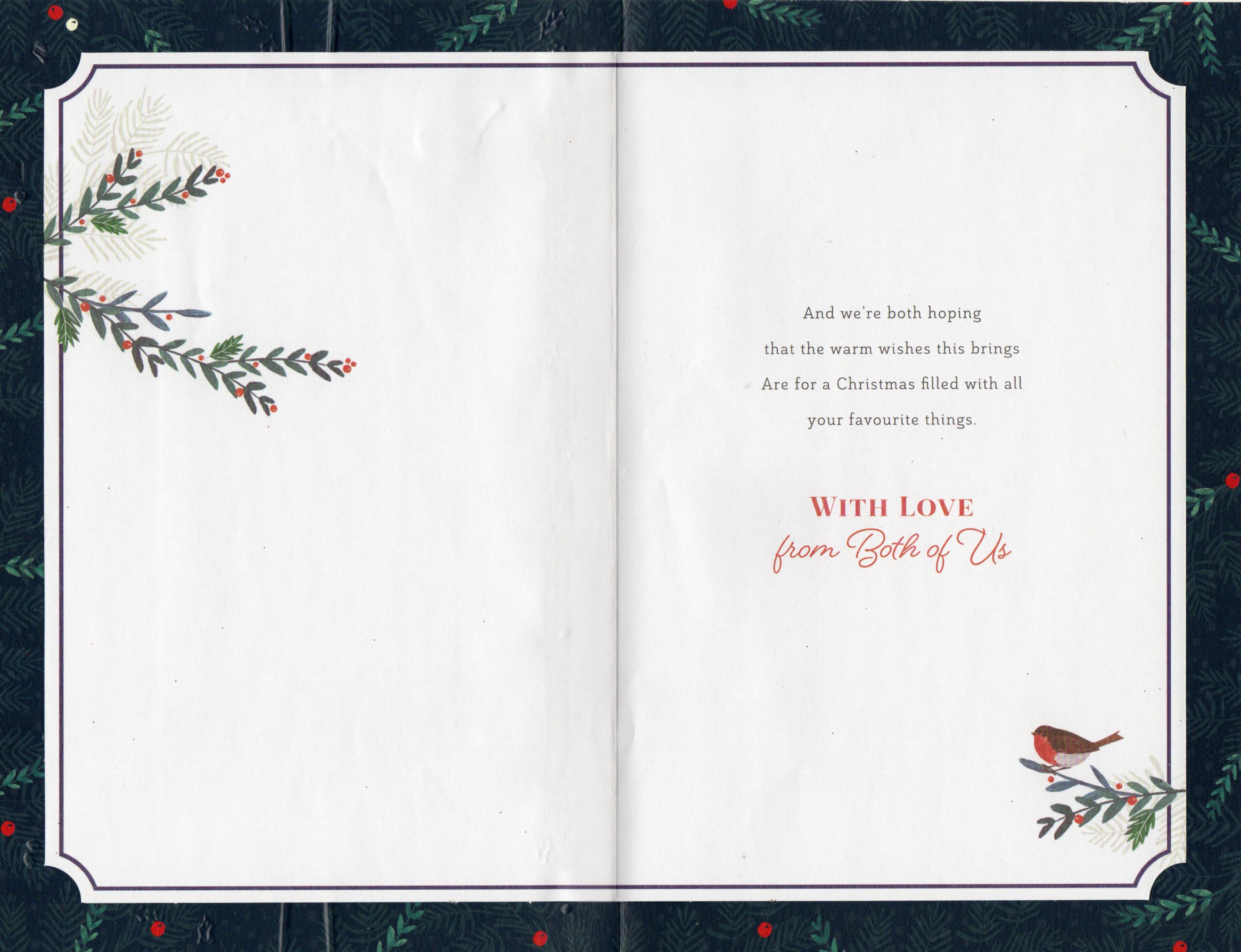 Inside reads: And we're both hoping that the warm wishes this brings Are for a Christmas filled with all your favourite things. With Love from Both of Us