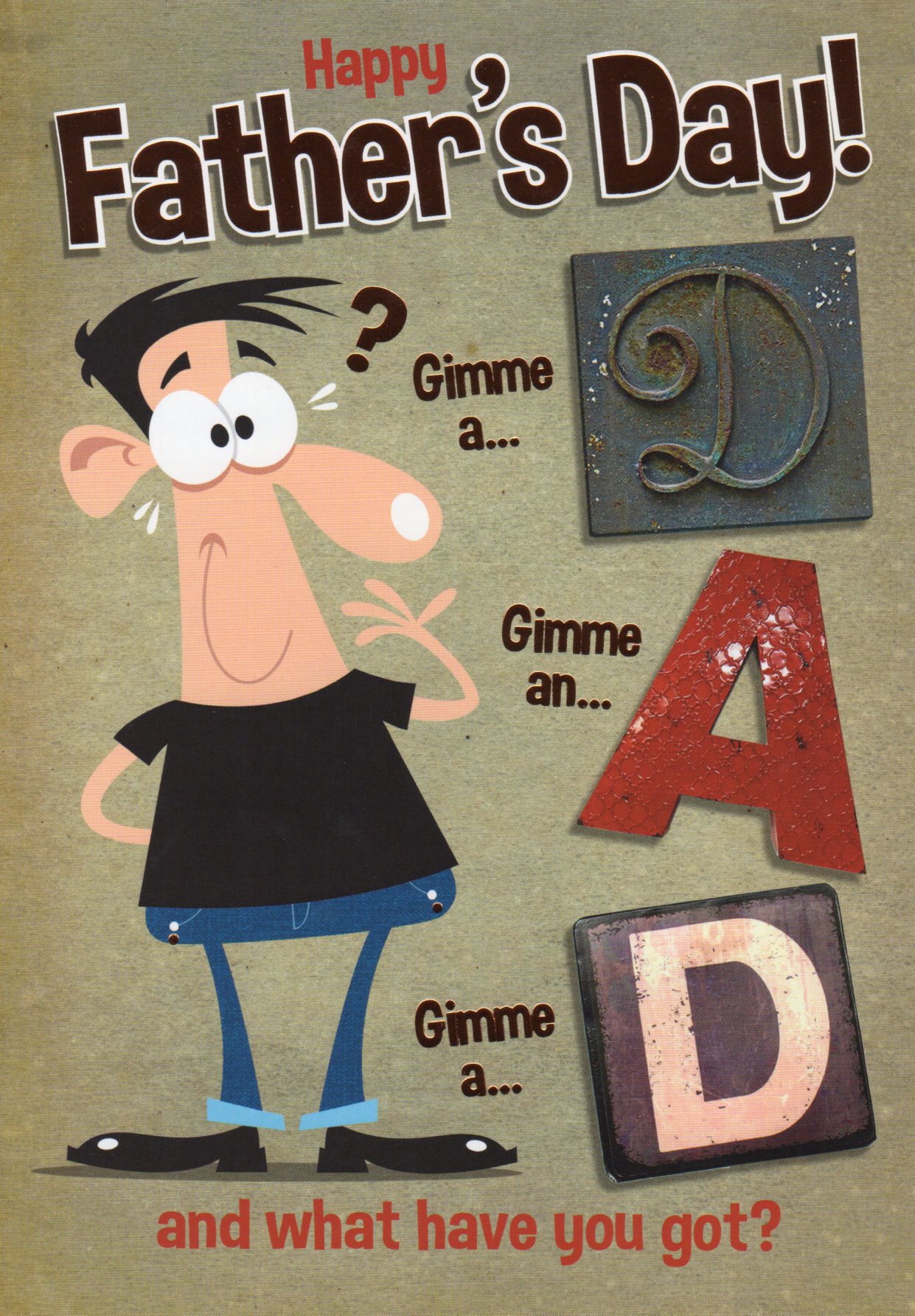 On the front the card reads: Happy Father's Day! Gimme a..., Gimme an..., Gimme a..., and what have you got?
