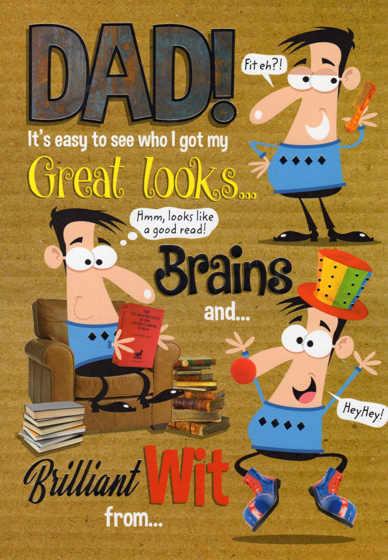 On the front the card reads: Dad! It's easy to see who I got my Great Looks..., Brains and..., Brilliant from...