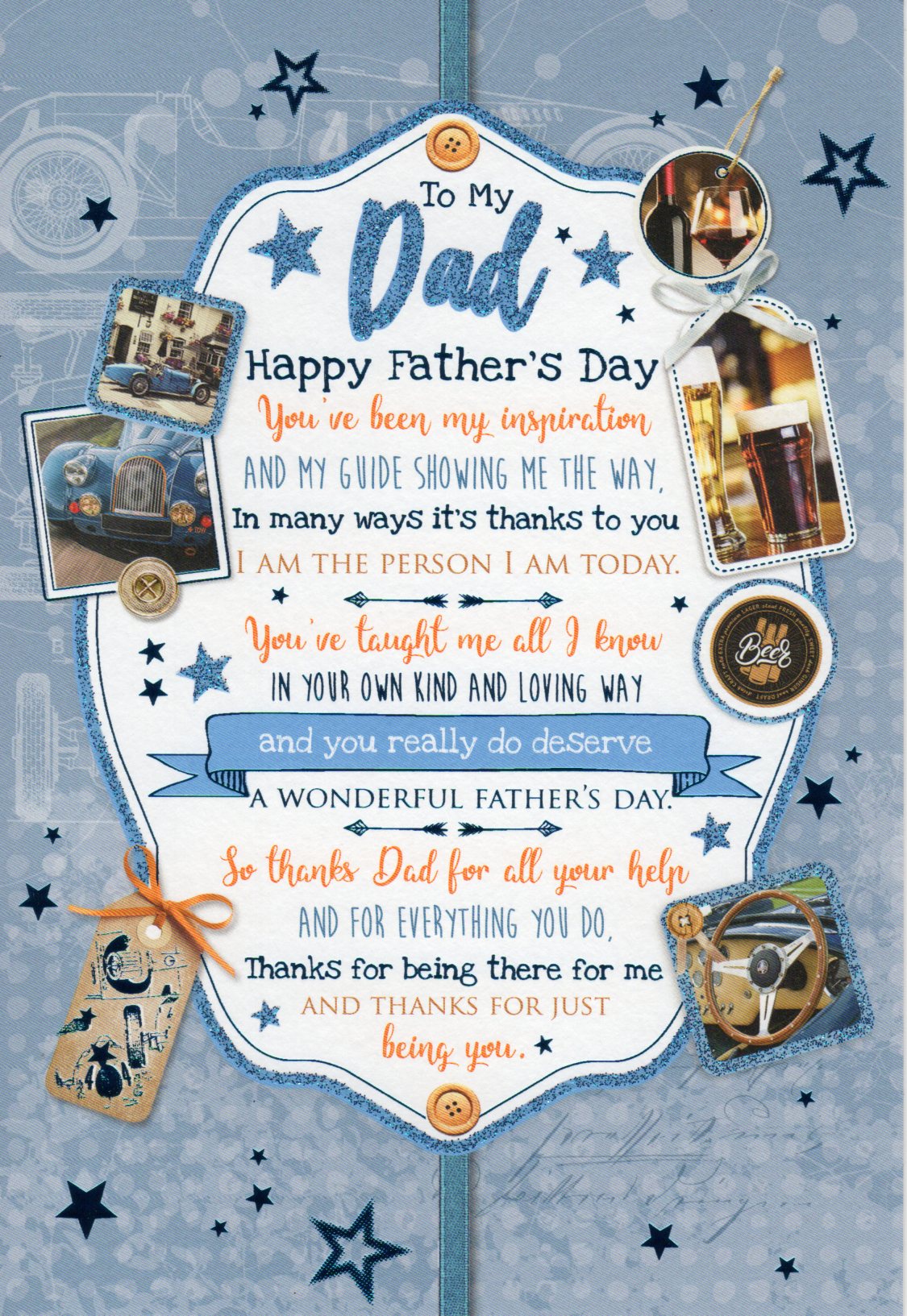 On the front the card reads: To My Dad Happy Father's Day, you're been my inspiration and my guide showing me the way, in many ways it's thanks to you I am the person I am Today. You've taught me all I know in your own kind and loving way and you really do deserve a wonderful Father's Day. So thanks Dad for all your help and for everything you do, Thanks for being there for me and thanks for just being you.