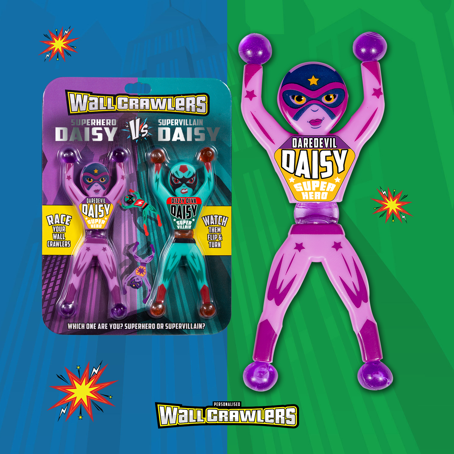 Throw your superhero and supervillain Wall Crawlers at a smooth vertical surface- try a wall, window or even bathroom tiles and see a super race in action!