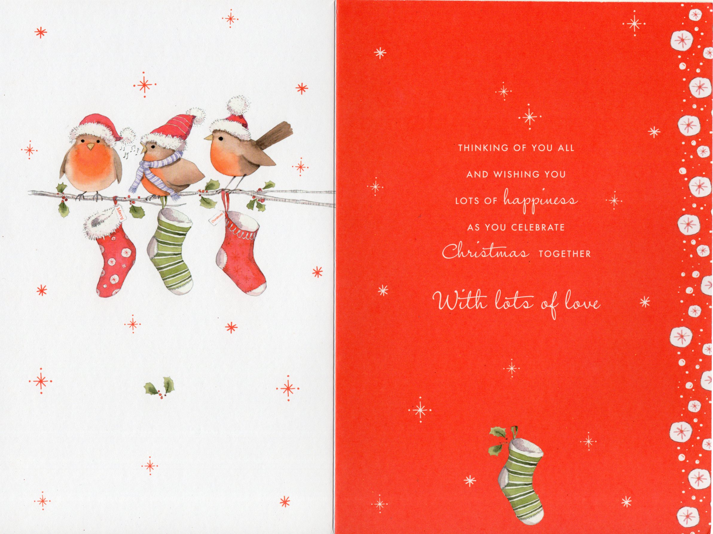 Inside reads: thinking of you all and wishing you lots of happiness as you celebrate Christmas together with lots of love
