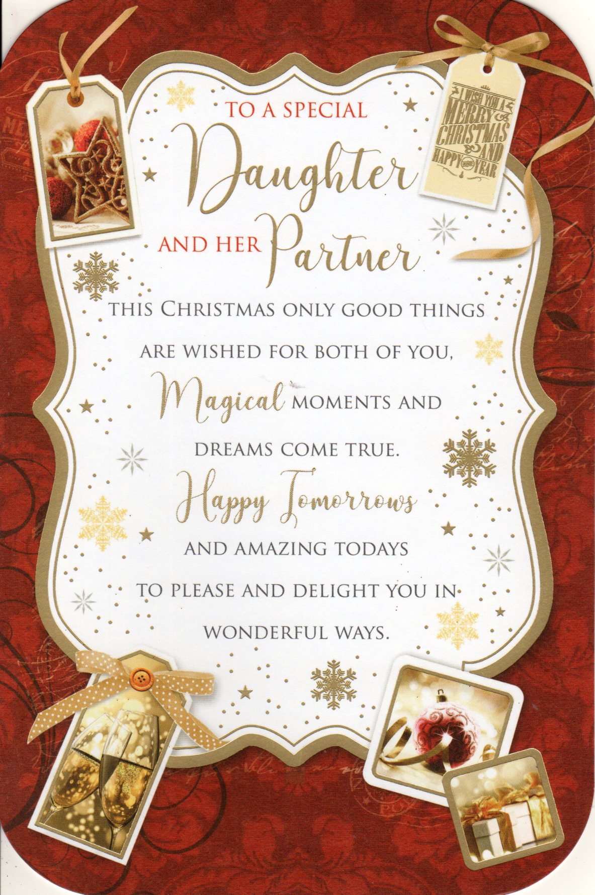 On the front the card reads: To A Special Daughter And Her Partner this Christmas only good things are wished for both of you, magical moments and dreams come true. Happy Tomorrows and amazing todays to please and delight you in wonderful ways.