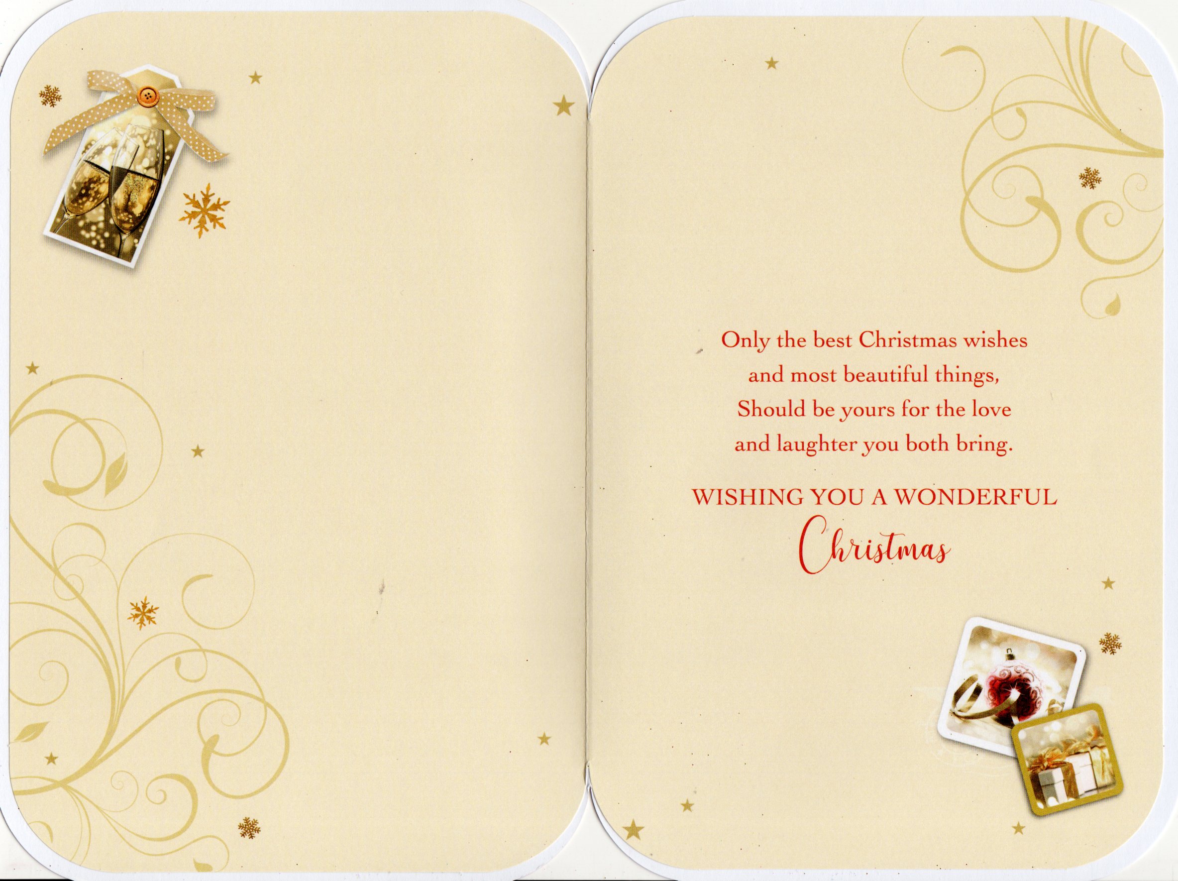 Inside reads: Only the best Christmas wishes and most beautiful things, Should be yours for the love and laughter you both bring. wishing you a wonderful Christmas