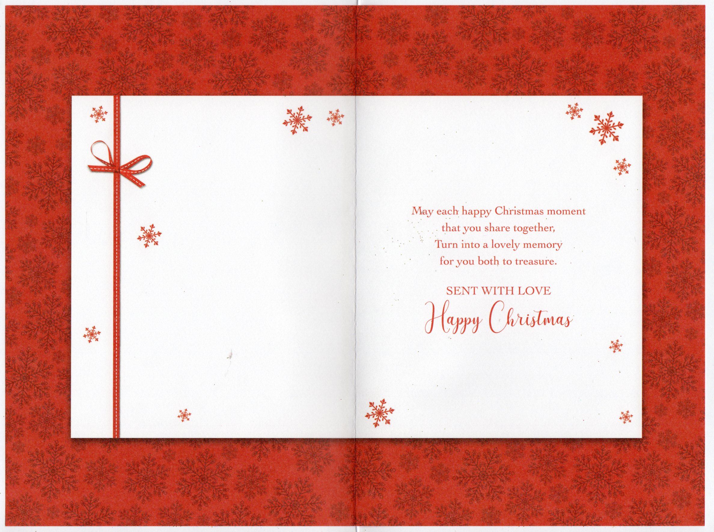 Inside reads: May each happy Christmas moment that you share together, Turn into a lovely memory for you both to treasure. sent with love Happy Christmas