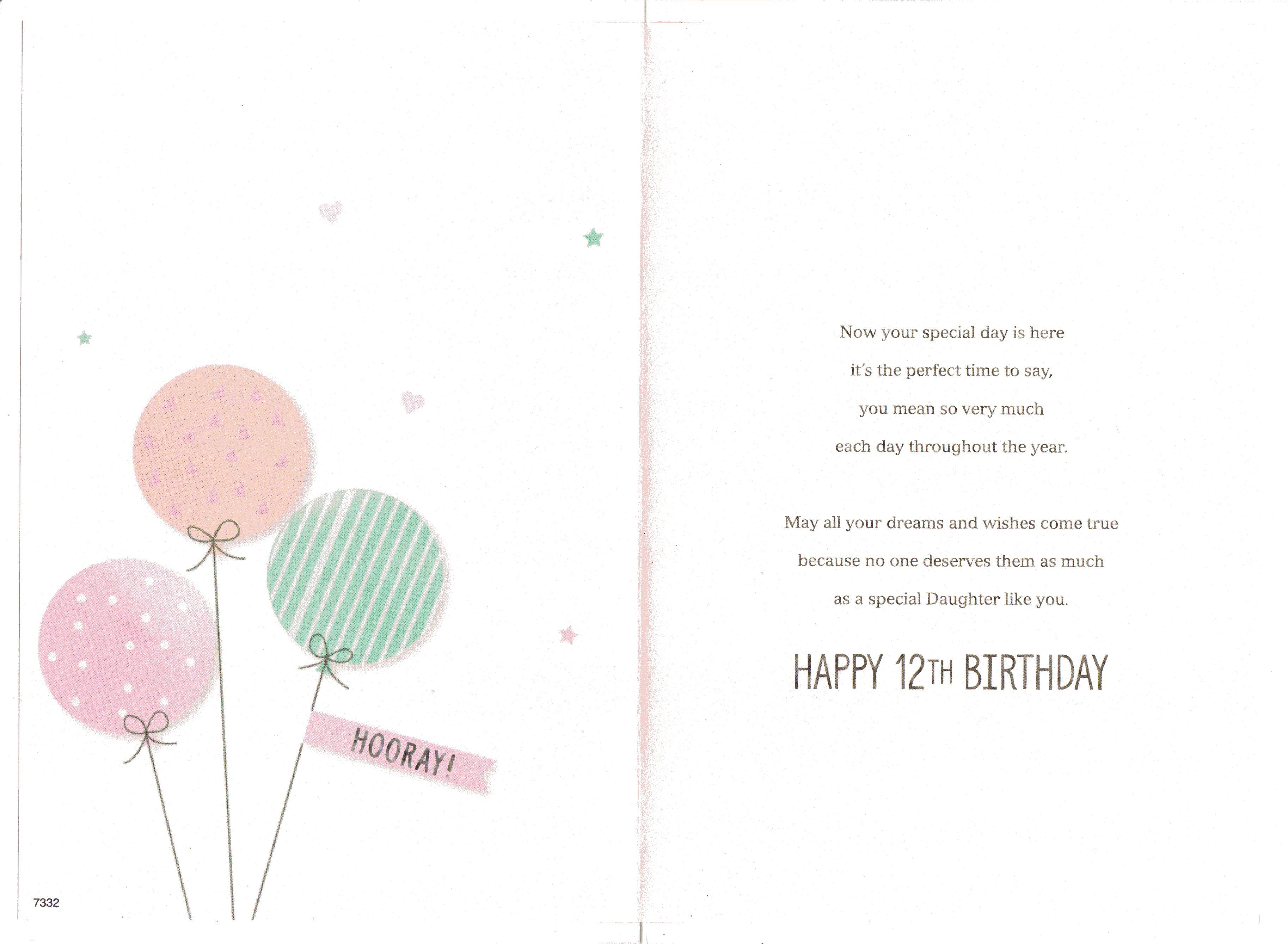 Inside reads: Now your special day is here it's the perfect time to say, you mean so very much each day throughout the year. May all your dreams and wishes come true because no one deserve them as much as a special Daughter like you. Happy 12th Birthday.