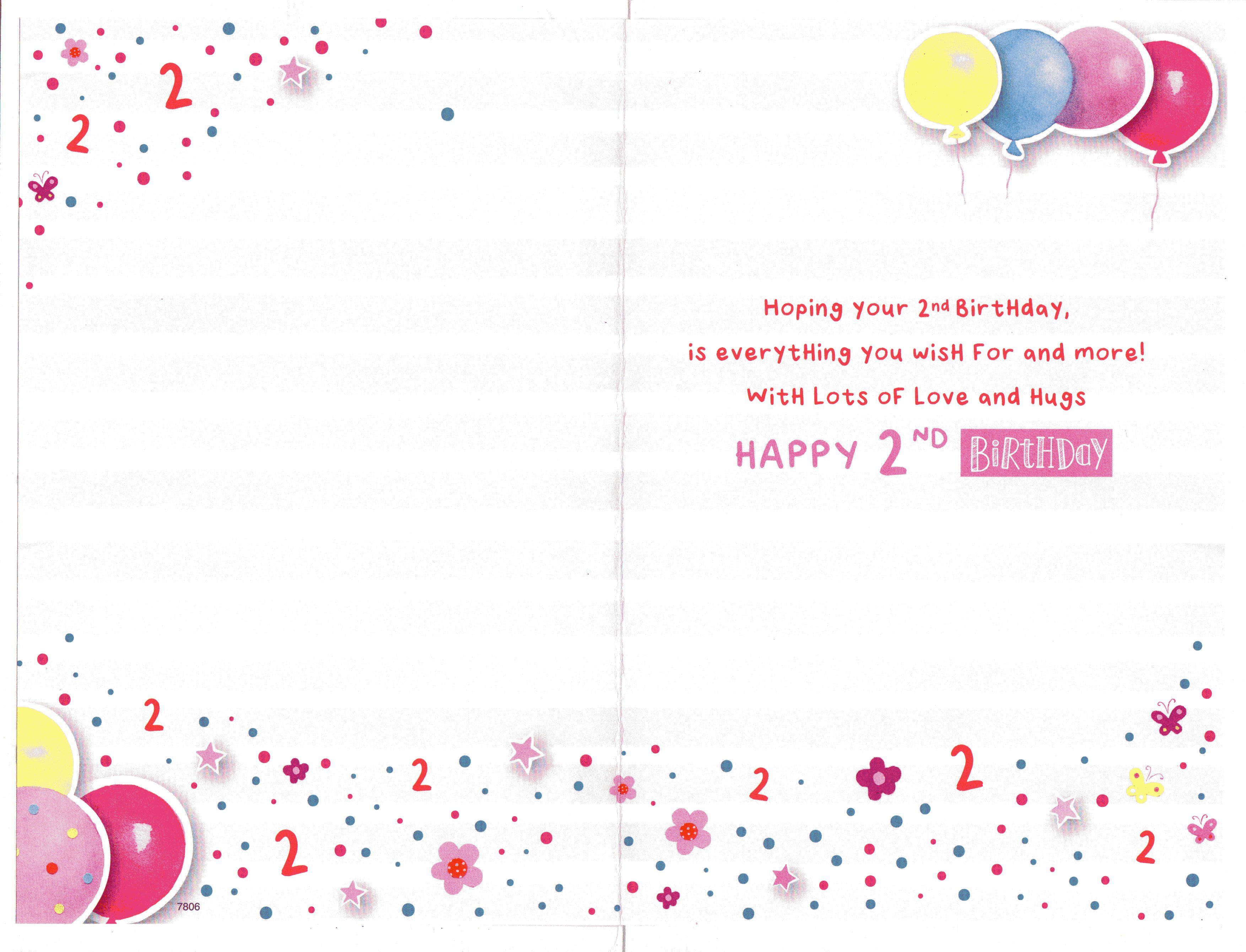 Inside reads: Hoping your 2nd Birthday, is everything you wish for and more! with lots of Love and hugs. Happy 2nd Birthday.